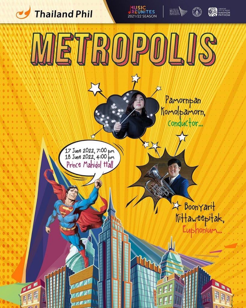 A group of Mahidol University International College’s (MUIC) Communication Design Program (CDP) students from all year levels created the motion graphics and animation for the Thailand Philharmonic Orchestra’s “Metropolis Concert” on June 17-18, 2022 at Prince Mahidol Hall, Mahidol University, Salaya campus.
