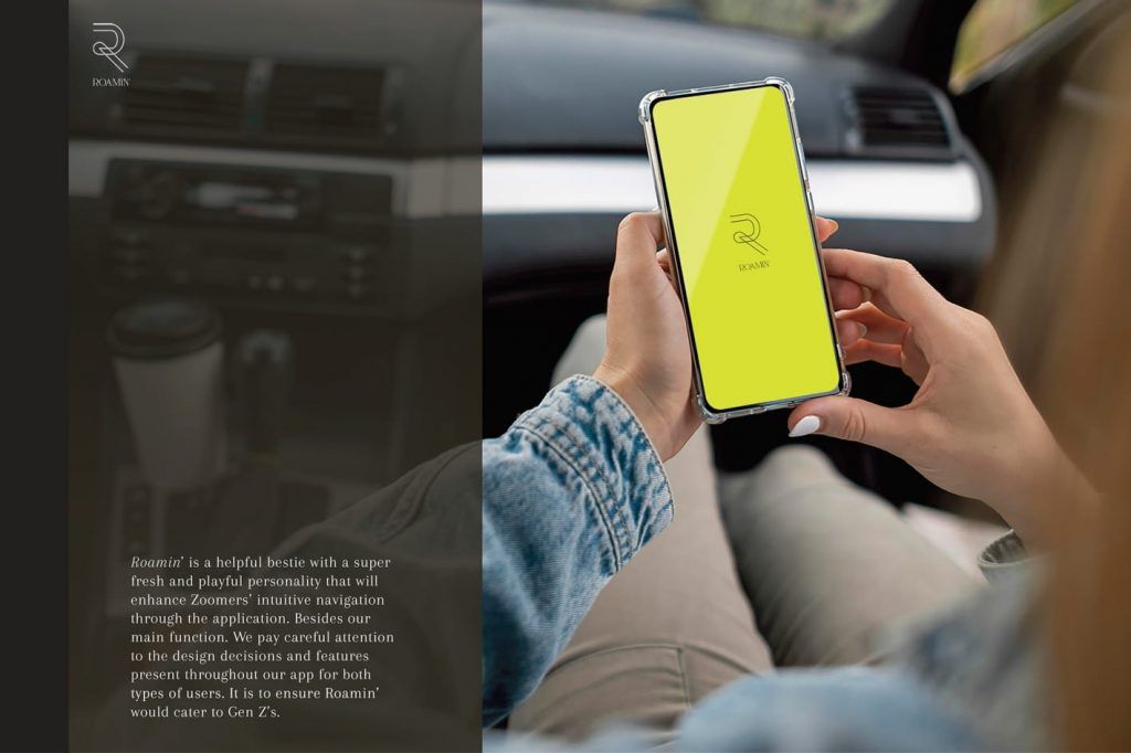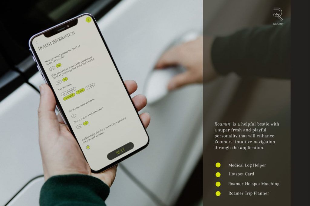 2. “Roamin’: Zoomers’ Intuitive Navigation” (post-Covid theme phone application) created by Ms. Pattatan Pawatuangsunit, Ms. Ananya Pawa, Mr. Neranchara Rujiprachakorn, Mr. Kan Mekrugsawanich, Ms. Sukritta Saenverm and Mr. Panuves Ratanachaijaroen.