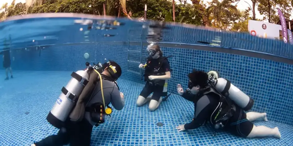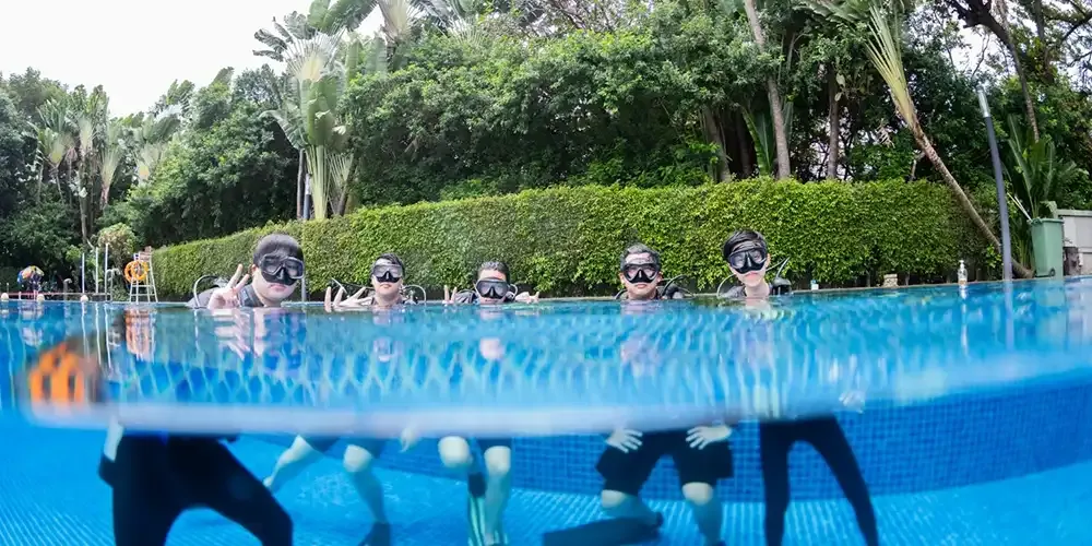 Within the pool's controlled environment, participants had the opportunity to practice a set of crucial skills. This included assembling dive equipment, donning the gear using proper techniques, conducting buoyancy checks at the surface, inflating/deflating the BCD (Buoyancy Control Device) on the surface, adopting proper breathing patterns, and maintaining buoyancy while swimming, among other vital skills. Additionally, participants practiced the giant stride entry into the scuba diving pool, which simulated a 5-meter depth, preparing them for the real giant stride entry from a boat.