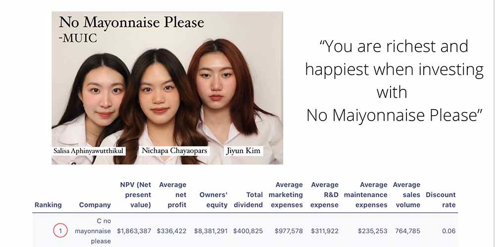 The winners from MUIC, who were members of the No Mayonnaise Please team, were Ms. Nichapa Chayaopars (International Business), Ms. Salisa Aphinyawutthikul (Finance), and Ms. Jiyun Kim (Business Economics). The sponsor, Top Boss Taiwan, rewarded the 2nd Runner-up with a 10,000 Baht cash prize.