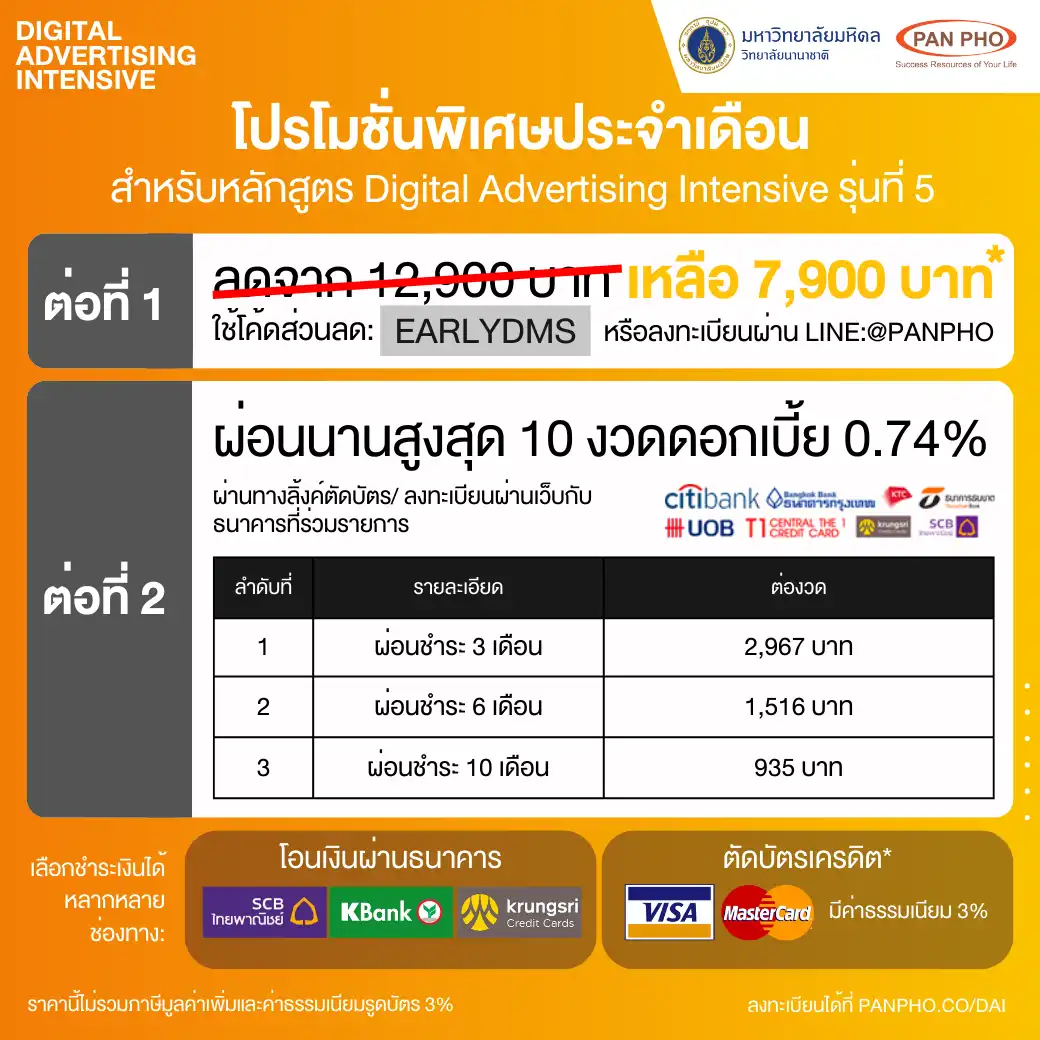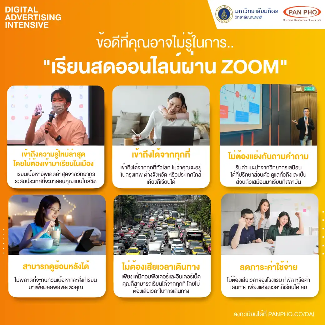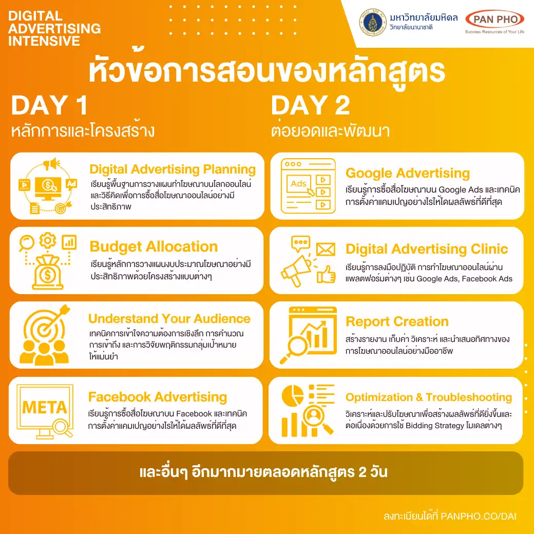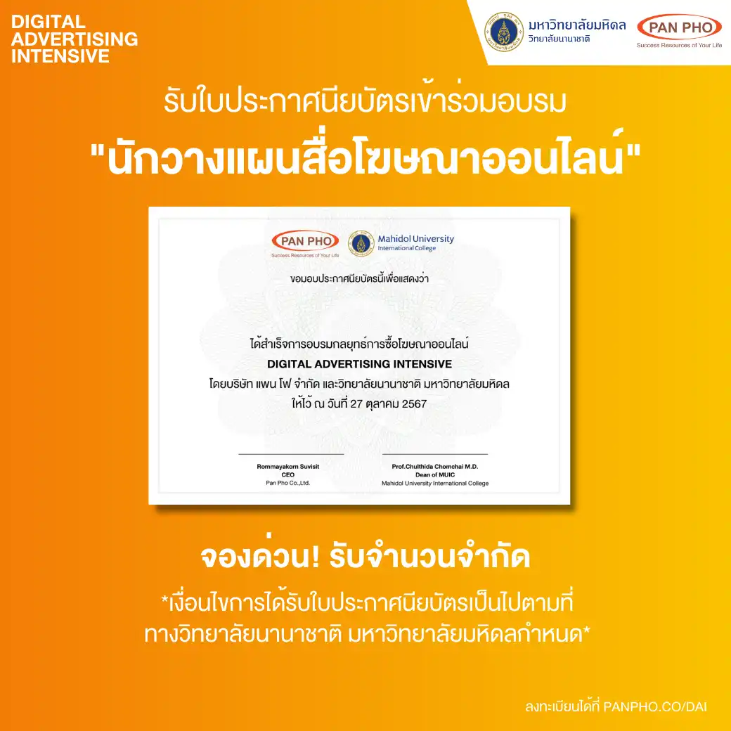 The Digital Advertising Intensive Batch 5th will be held on October 26–27, 2024, from 9:00 a.m.–5:30 p.m. in the virtual interactive format, will be facilitated via Zoom. The seats are limited. For further details, please visit our partner website: https://panpho.co/dai or direct chat via LINE: @PANPHO.