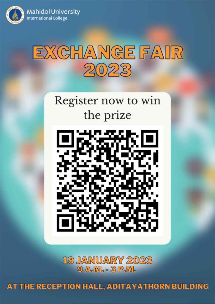 Student Exchange Unit is pleased to invite you all to join MUIC Exchange Fair 2023 on Thursday 19th of January 2023 at the reception hall,  Aditayathorn Building from 9:00 A.M. – 15:00 P.M.