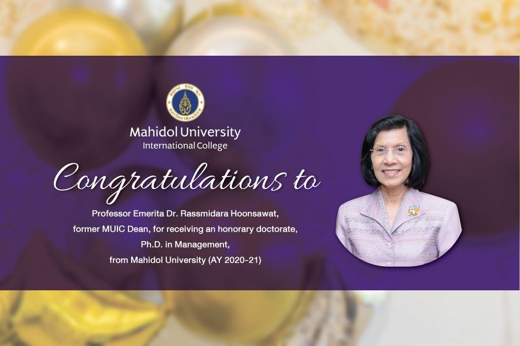 Congratulations to Professor Emerita Dr. Rassmidara Hoonsawat, former MUIC Dean, for receiving an honorary doctorate, Ph.D. in Management, from Mahidol University (AY 2020-21)
