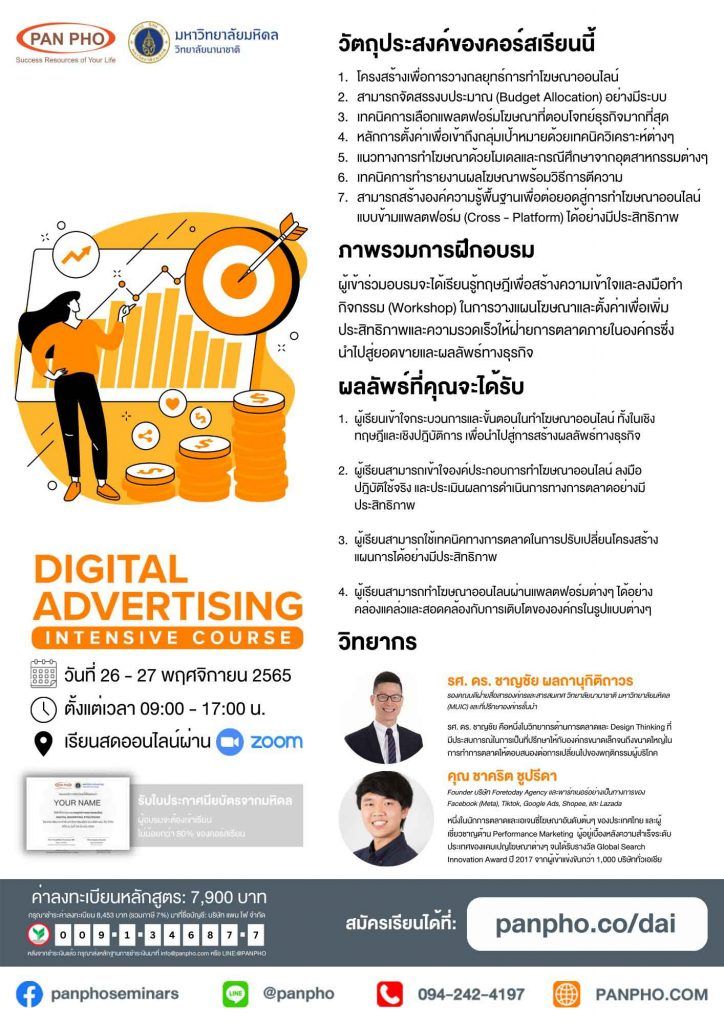 Digital Advertising Intensive course will be held on Saturday 26 – Sunday 27 November 2022 from 9.00 - 17.30. The Session will be conducted virtually via Zoom. The limited number of applications. You can apply today via the Website: panpho.co/dai or via LINE: @PANPHO (24 hours a day).