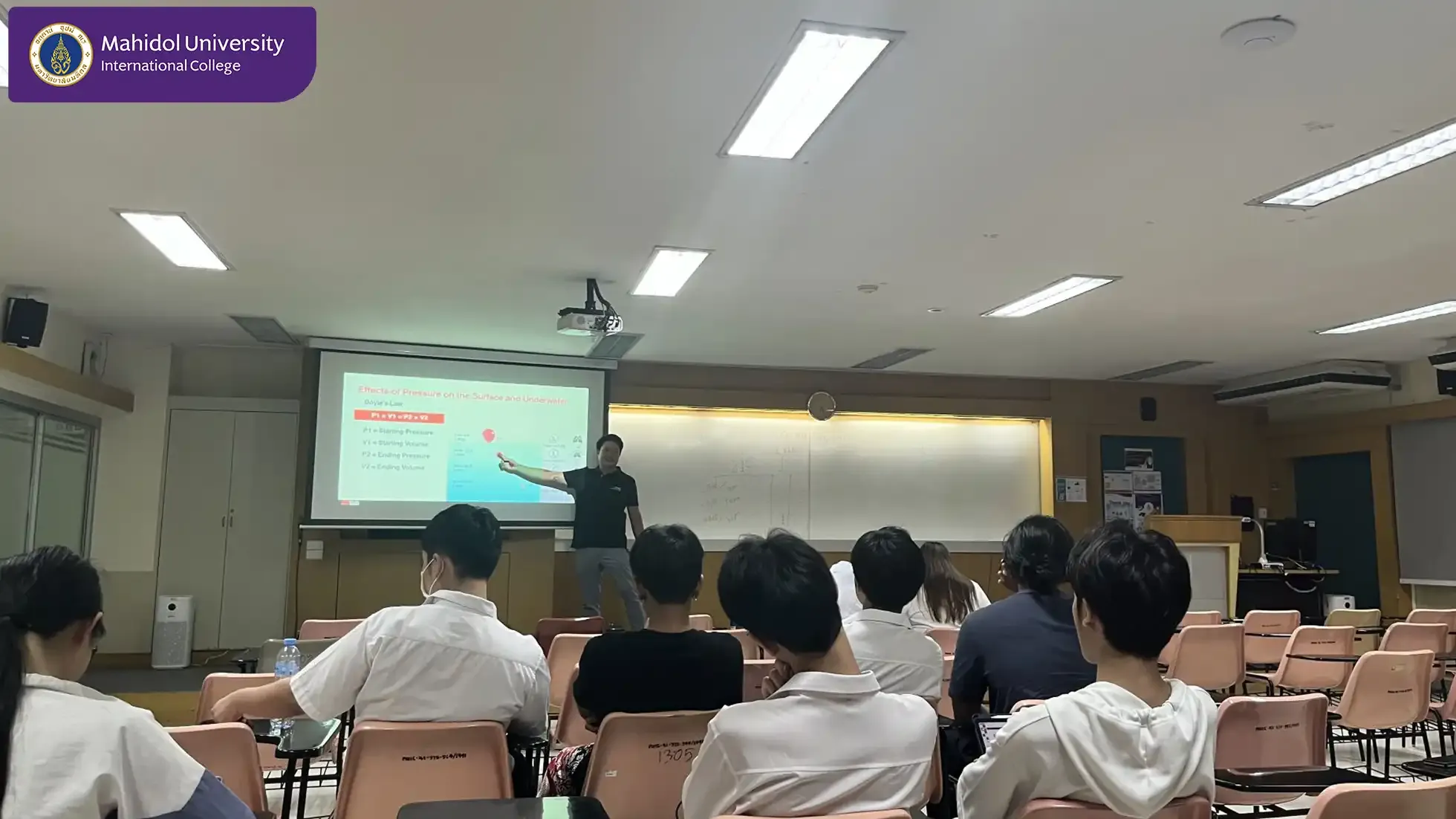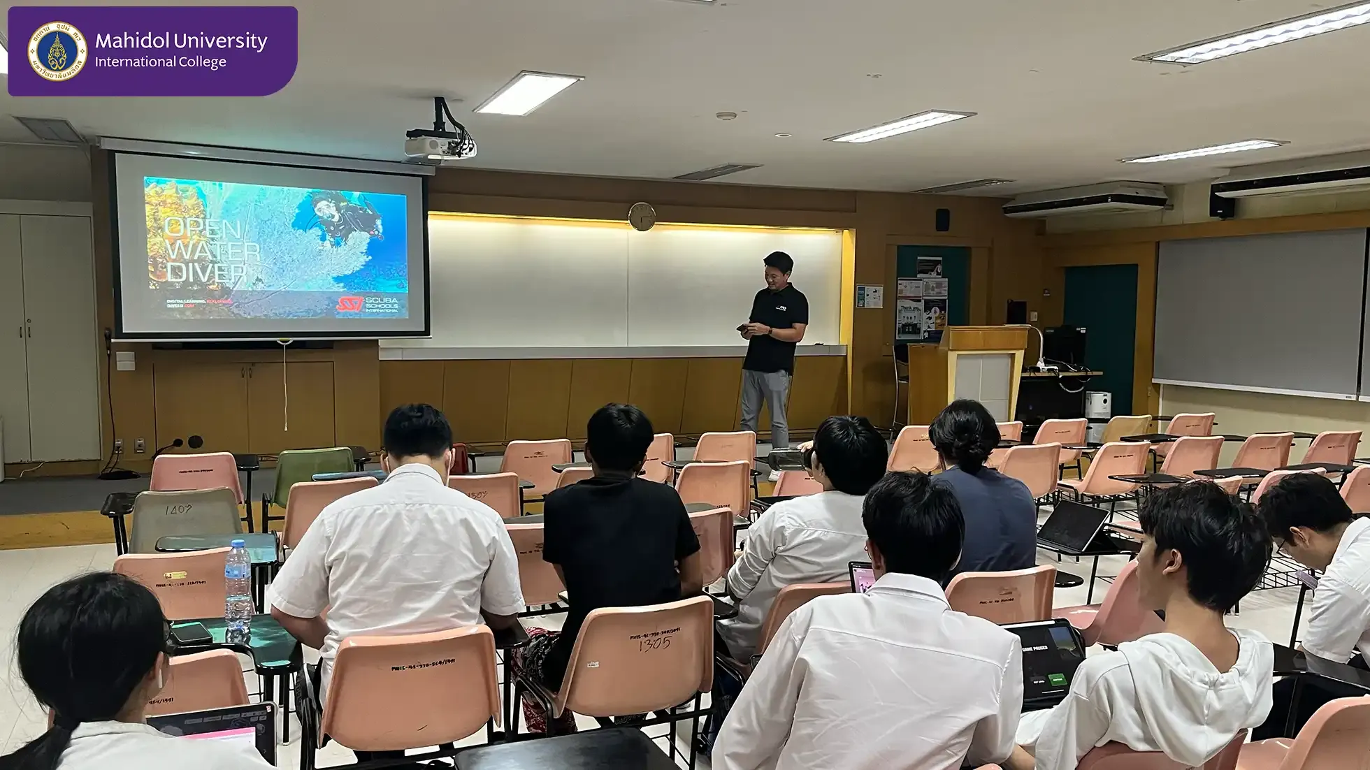 The Diving Club of Mahidol University International College (MUIC) provided a comprehensive theory class in scuba diving for 21 students at Room 1315, MUIC Old Building 1 on November 7, 2024.