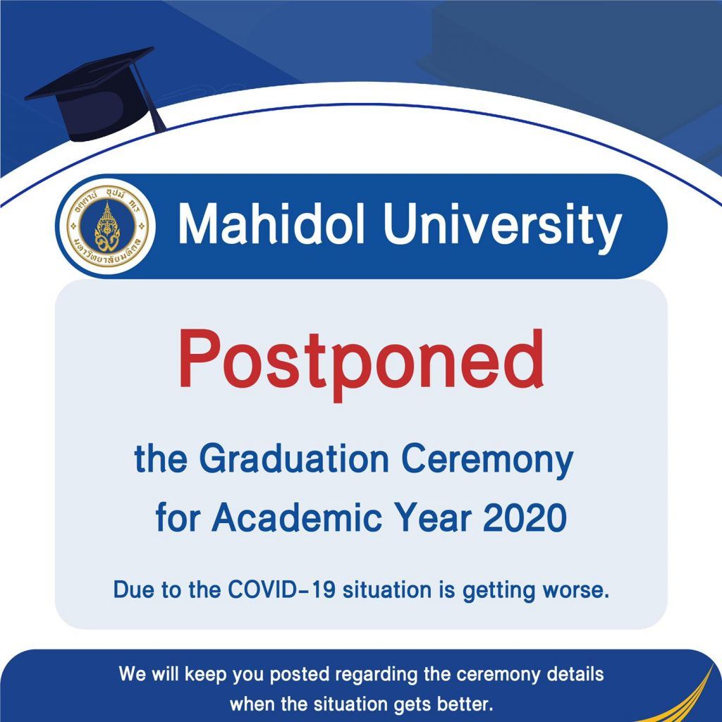 Mahidol University postponed the Graduation Ceremony for Academic Year 2020 because the COVID-19 situation is getting worse.
