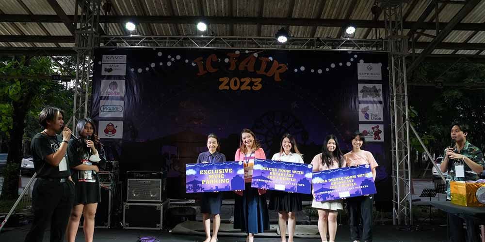 Ajarn Wimonsiri Hemtanon, Assistant Dean for Student Affairs, closed the event and chose the IC Fair 2023 lucky draw winners. The winners included Ms. Harutai Srirukthum, who received the car parking slot at MUIC Building 1, Ms. Krannapas Aupatham received the car parking slot at Aditayathorn Building, Phascha Pitipattarasunthon received a voucher for a Deluxe Room from event sponsor Cape Dara. Lastly, Supapol Jirawatmetee received a voucher for a Dara Deluxe Room also from event sponsor Cape Dara.