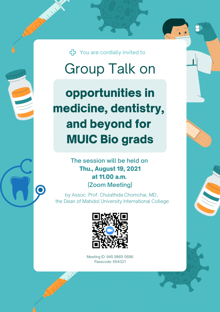 Then come and join the virtual group talk on “Opportunities in Medicine, Dentistry, and Beyond for MUIC Bio Grads” with Assoc. Prof. Chulathida Chomchai, MD, MUIC Dean, as main speaker on Thursday, August 19, 2021 at 11.00 a.m.