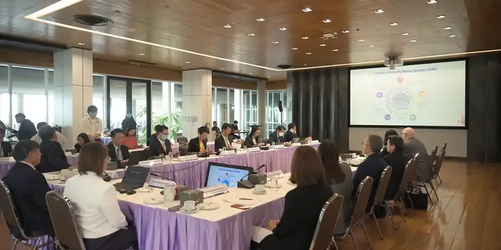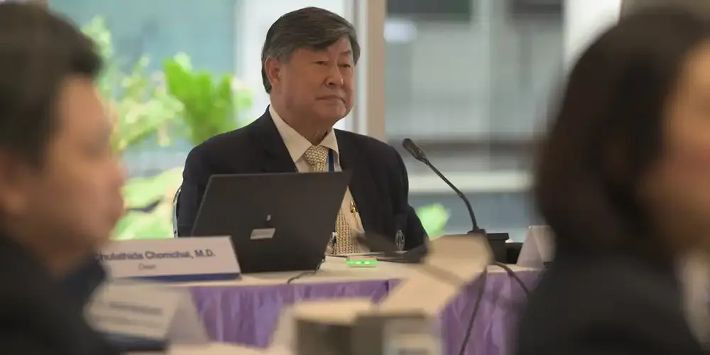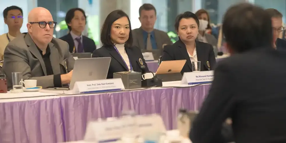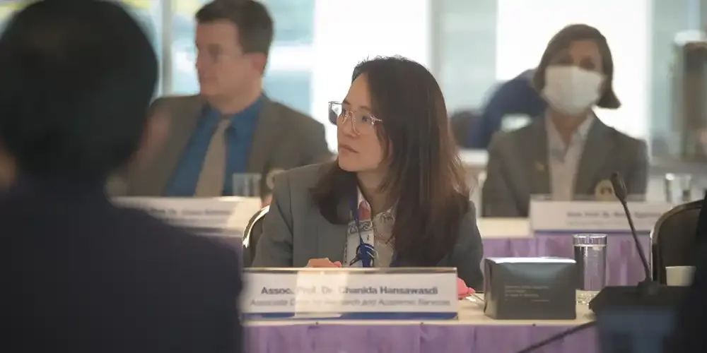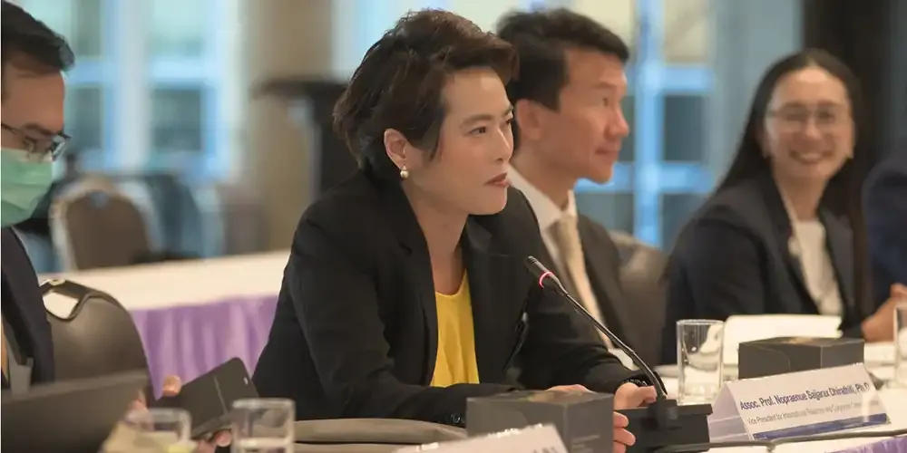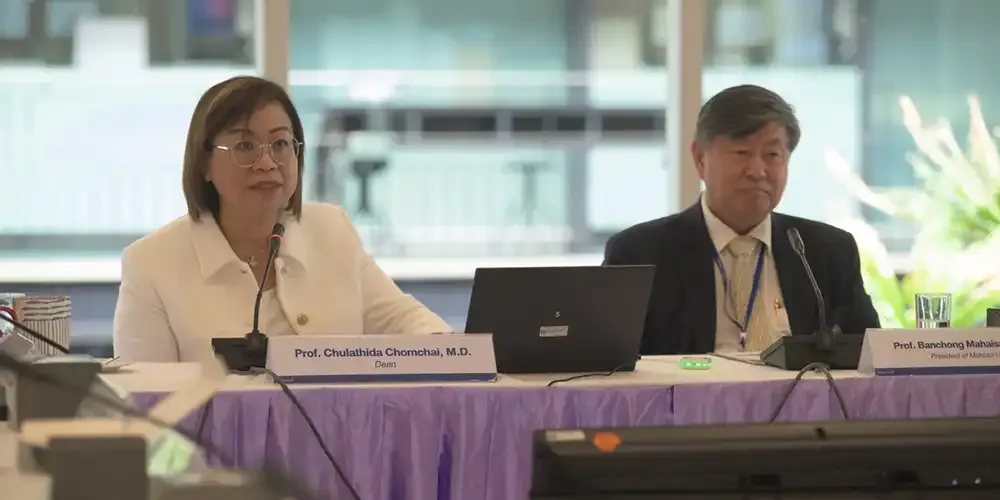 Prof. Banchong Mahaisavariya, M.D., President of Mahidol University, along with university executives, met with Prof. Chulathida Chomchai, M.D., Dean of Mahidol University International College (MUIC), and college executives, administration officials, and faculty members for the Performance Agreement (PA) 2024 Consideration Session on December 4, 2023.