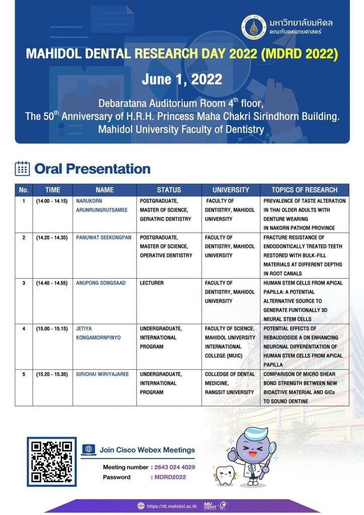 Organized by the Research Office, Mahidol University Faculty of Dentistry, the event took place at Debaratana Auditorium on the 4th Floor of the 50th Anniversary of H.R.H. Princess Maha Chakri Sirindhorn Building and was streamed live via Cisco Webex Meetings.