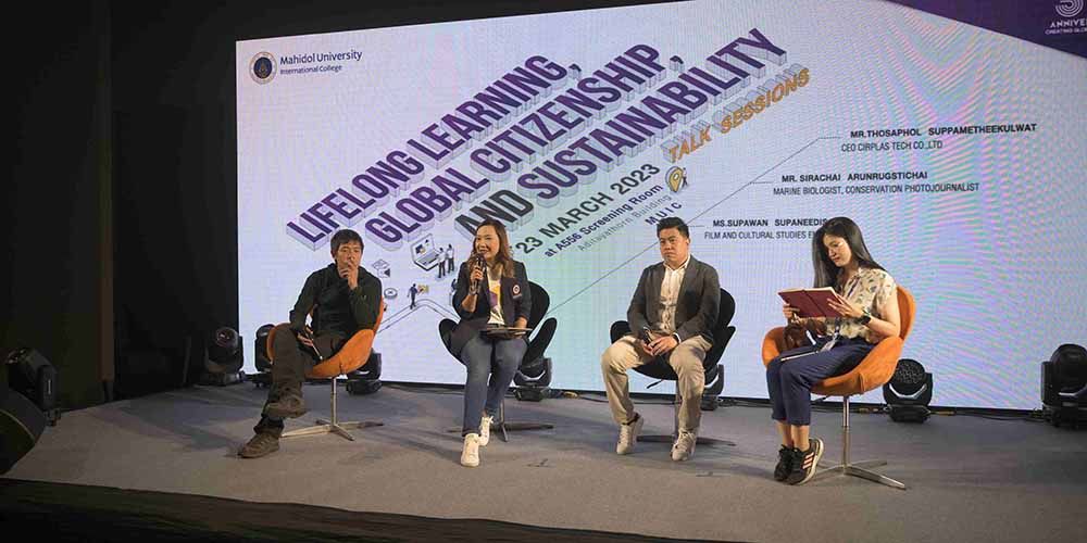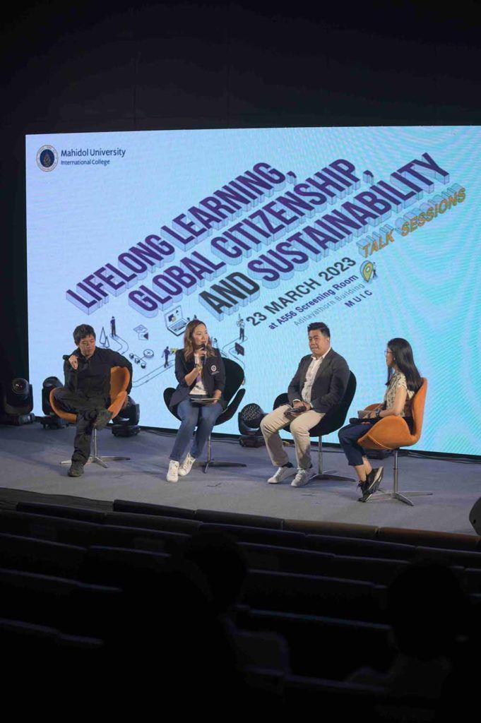 In the afternoon, a special talk session was held on the theme “Lifelong Learning, Global Citizenship, and Sustainability” featuring three successful MUIC alumni, namely, Mr. Thosaphol Suppametheekulwat, CEO CirPlas Tech Co., Ltd., Mr. Sirachai Arunrugstichai, Marine Biologist and Conservation Photojournalist, and Ms. Supawan Supaneedis, Film and Cultural Studies Enthusiast.