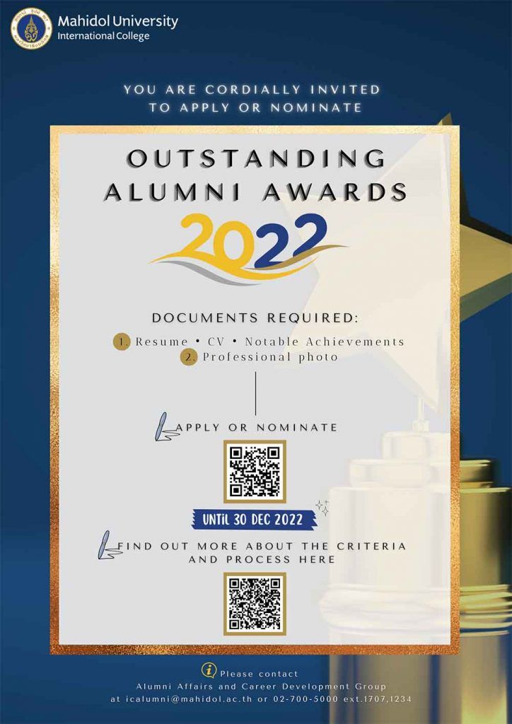 Mahidol University International College would like to encourage you to apply or nominate the MUIC Outstanding Alumni Award 2022.