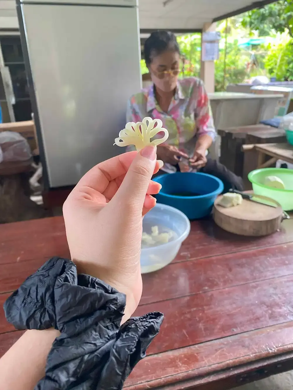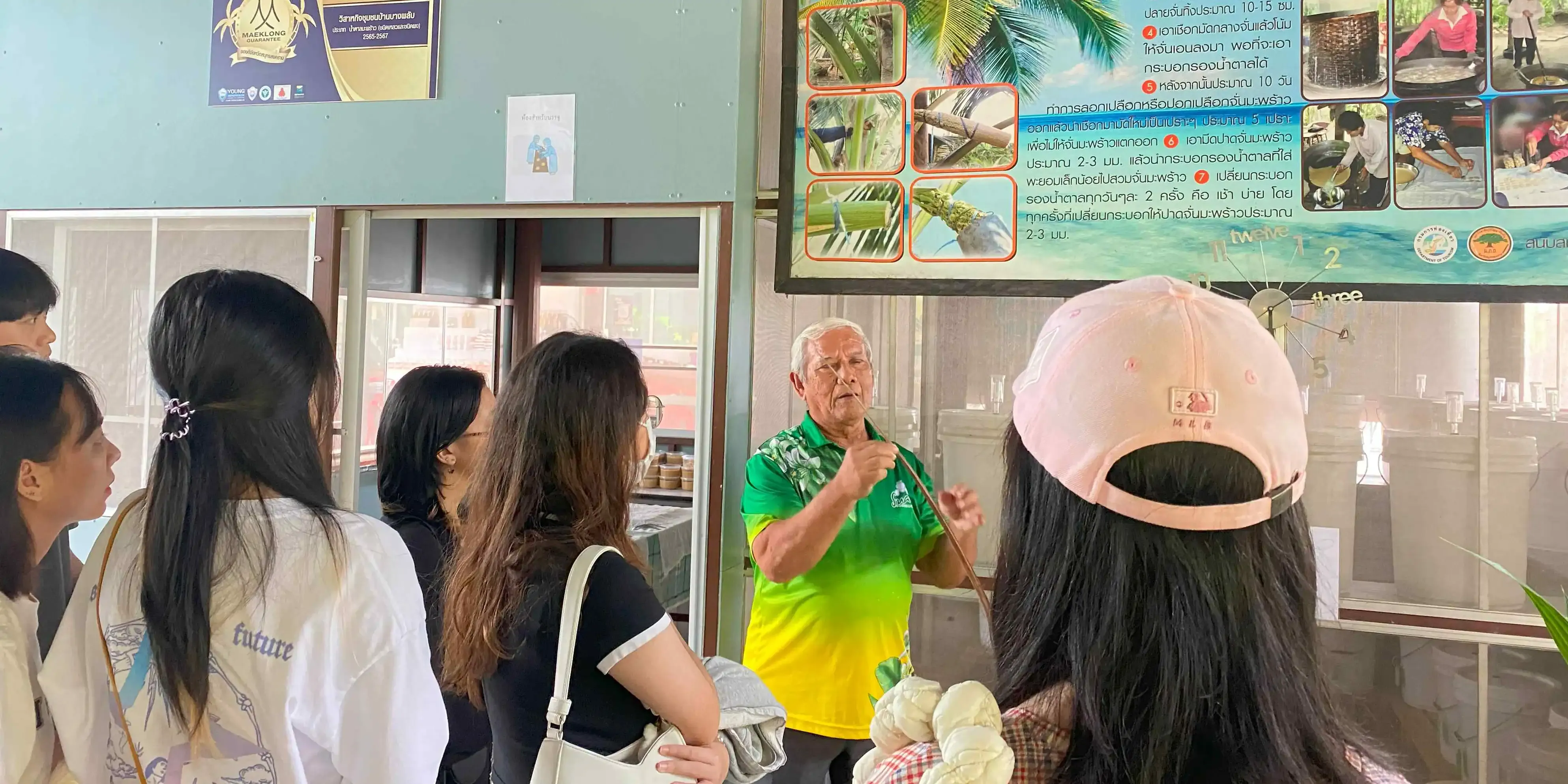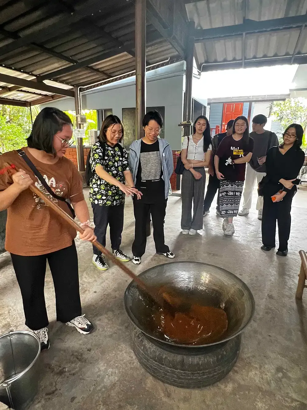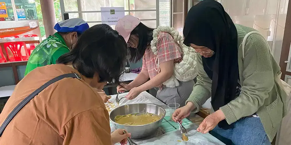The participating students, accompanied by two Student Affairs educators, learned about the history of the community and participated in four booth activities. These activities included coconut sugar production, traditional Thai sweets, and local food preservation.