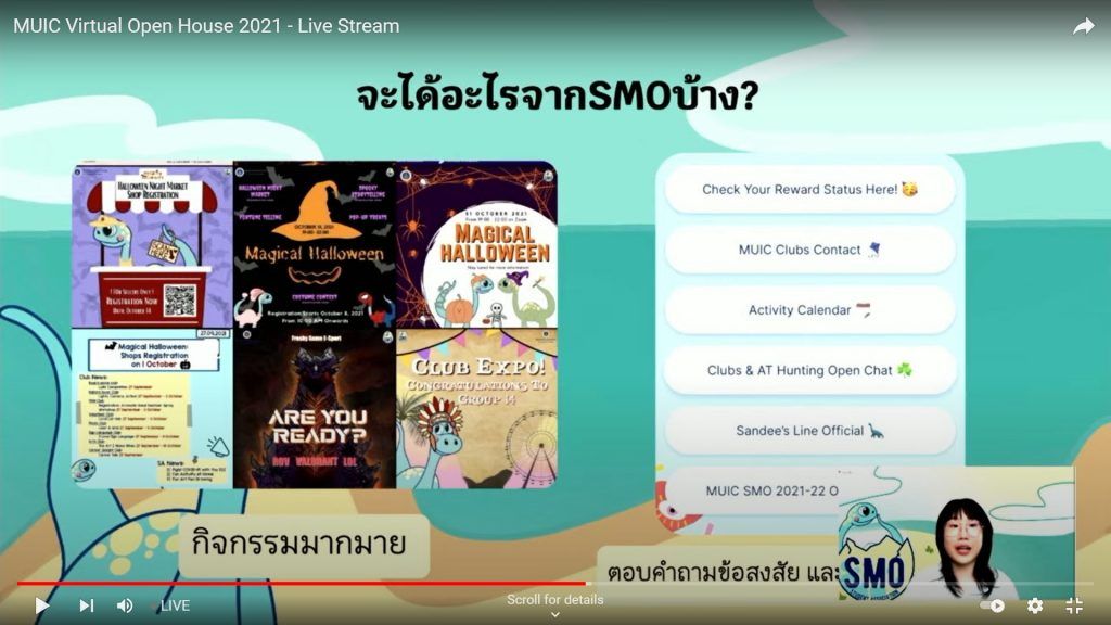The highlight of the event was a livestreaming on November 13 via Facebook and YouTube. Assoc. Prof. Dr. Chanchai Phonthanukitithaworn, Associate Dean for Corporate Communication and Information Technology, welcomed the online visitors and gave an introduction about the college. After that there were talk sessions with special topics discussed by MUIC lecturers and current students such as how to apply and prepare for an entrance exam, study programs, life in the campus, exchange program, virtual tour of college facilities and club showcases with a special show from the Theatre Club. There were over 1,000 visitors who attended the six-day event.