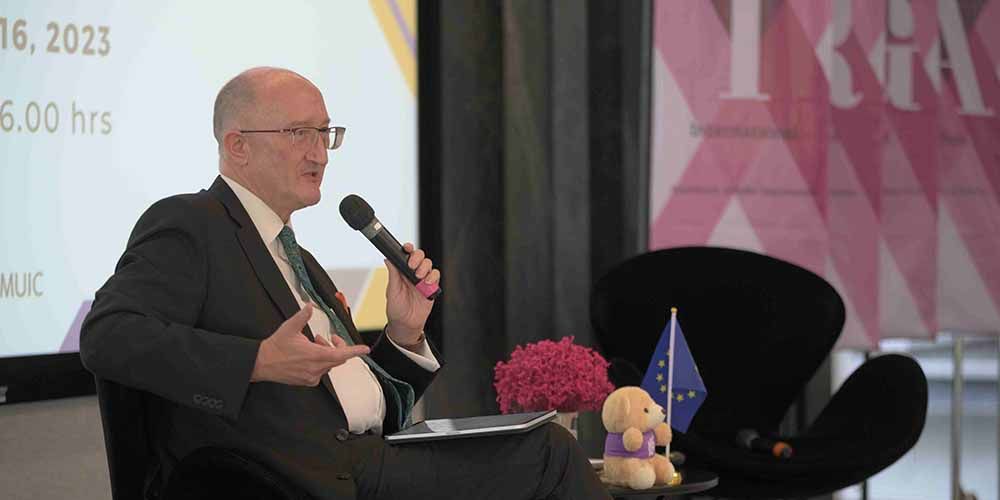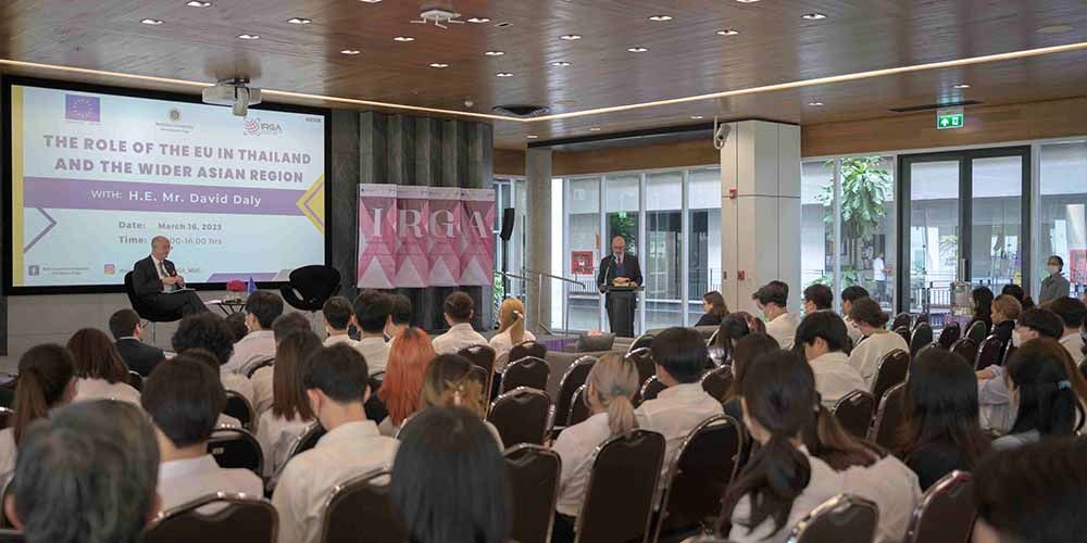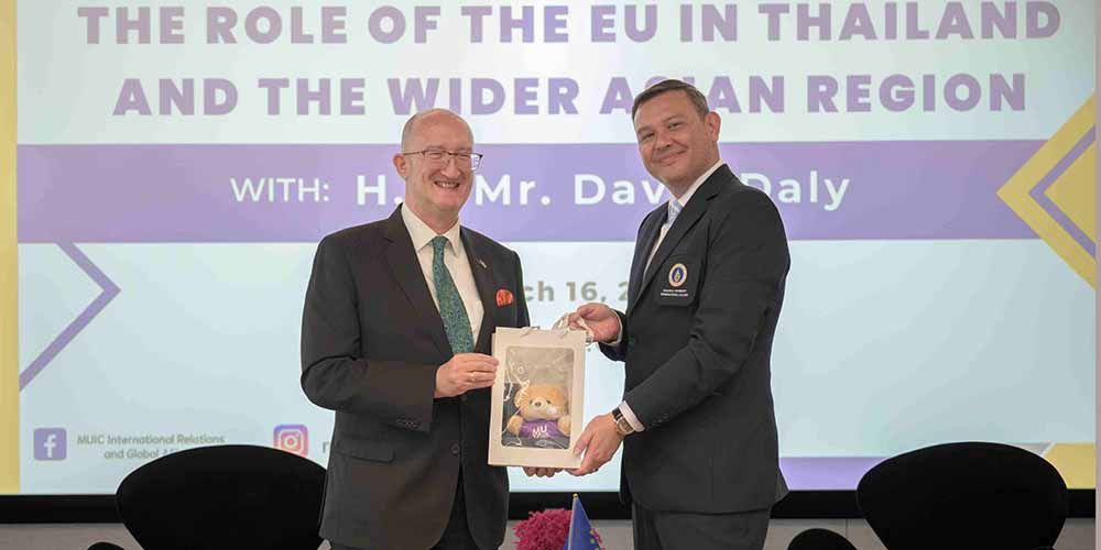 The International Relations and Global Affairs (IRGA) major program of Mahidol University International College (MUIC) hosted His Excellency David Daly, Ambassador of the European Union to Thailand, for a guest lecture on “The Role of the EU in Thailand and the Wider Asian Region” on March 16, 2023 at Charinyarasami Hall, Aditayathorn Building, MUIC.