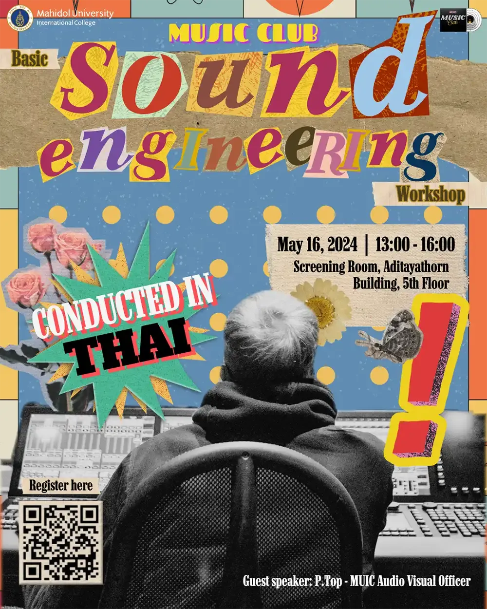 Mahidol University International College’s (MUIC) Music Club organized a “Basic Sound Engineering” workshop at the Screening Room, 5th Floor, Aditayathorn Building on May 16, 2024.