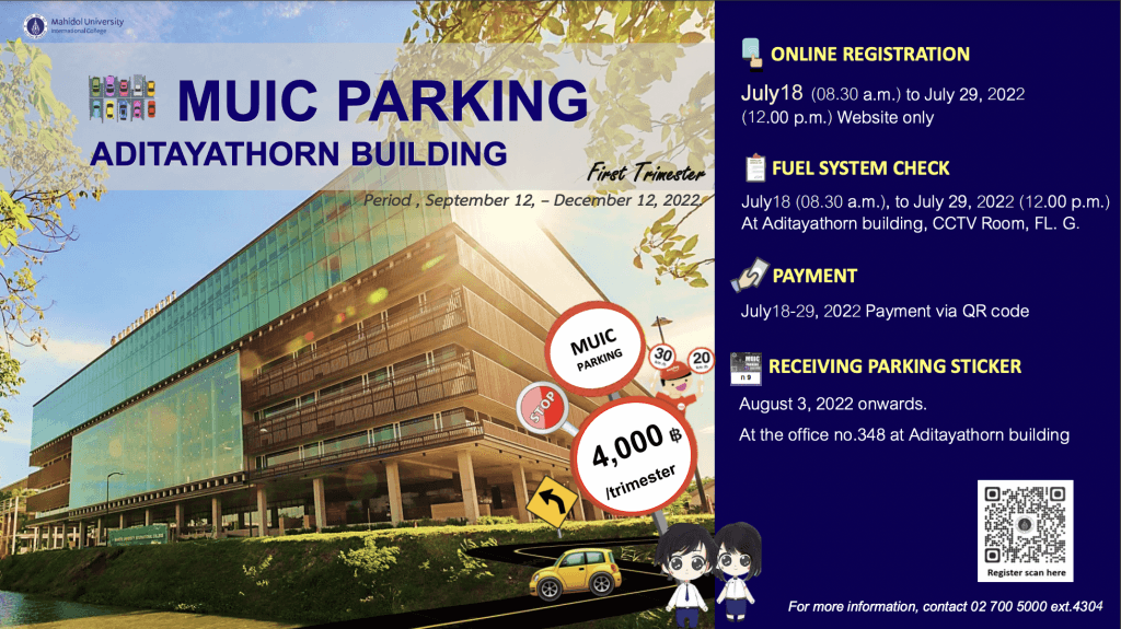 -Registration: July 18, (08:30 a.m.) to July 29, 2022 (Until 12:00 a.m.) Website only. https://icapp.muic.mahidol.ac.th/parking/