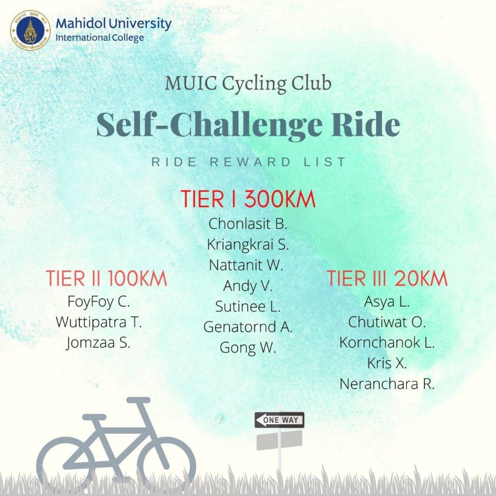 The MUIC Cycling Club launched a competition called “Self-Challenge Ride” on May 17, 2021 where participants had to go out cycling and earn prizes based on the distance they can cover.
