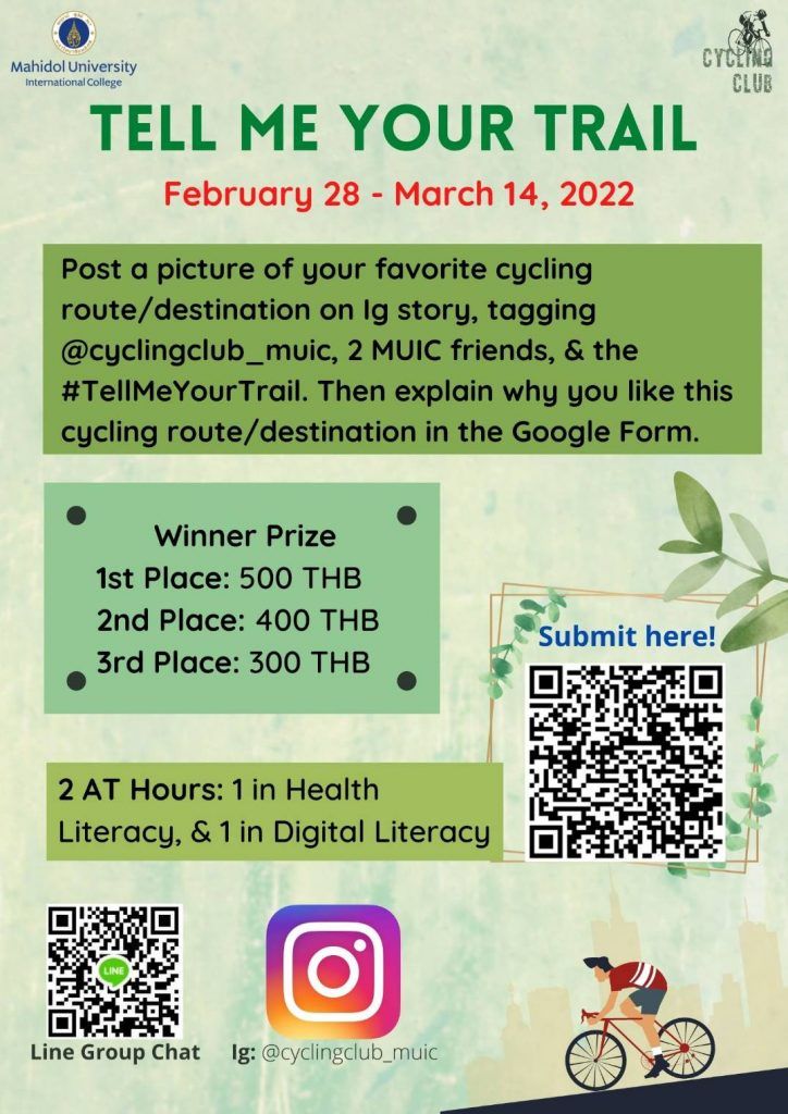 Take a picture of any local cycling route or destination that you like and post an IG story with @cyclingclub_muic and #TellMeYourTrail