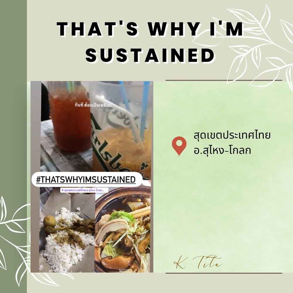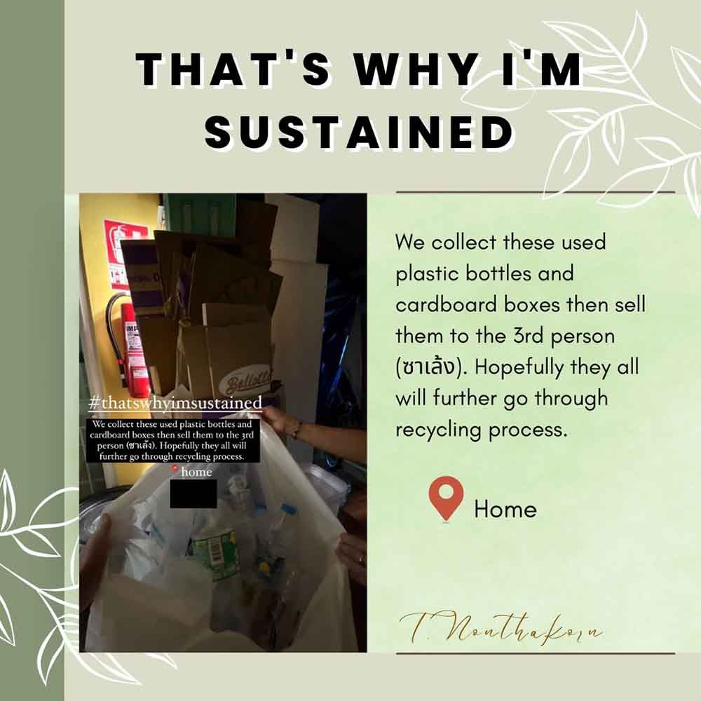 The participants were asked to share local things (like products, services, cultures, places, etc.) that sustain their community on their Instagram Story along with a caption. They were also required to pin the location as well as a hashtag (#THATSWHYIMSUSTAINED) in order to increase the participants’ and audiences’ awareness. The aim of this activity was to encourage participants to observe what is going on in their own local community and learn how factors mentioned above can be sustained.