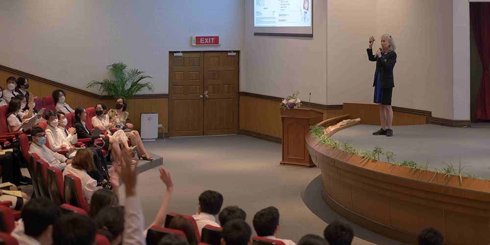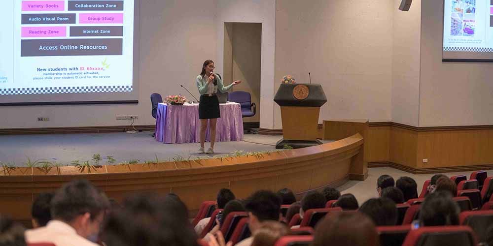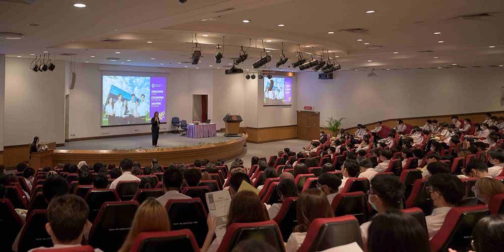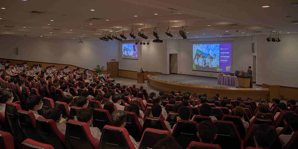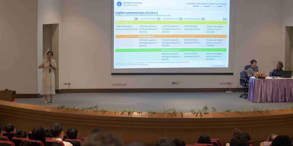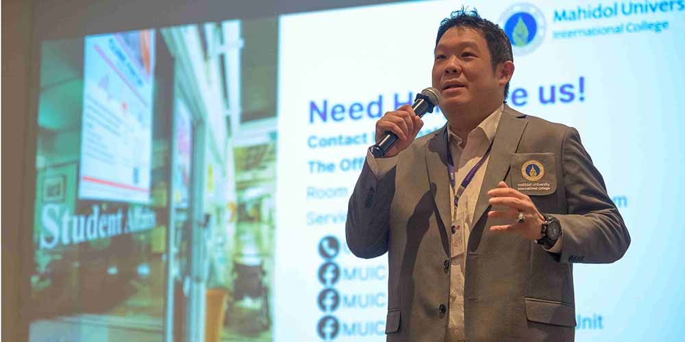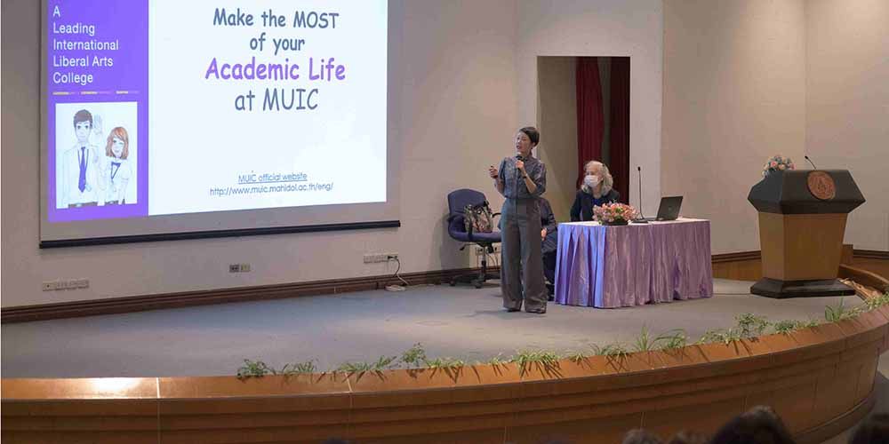 Prof. Chulathida Chomchai, M.D., MUIC Dean, delivered the welcoming speech and provided the MUIC mission to the students on “Enriching Lives, Expanding Potentials and Shaping Futures".