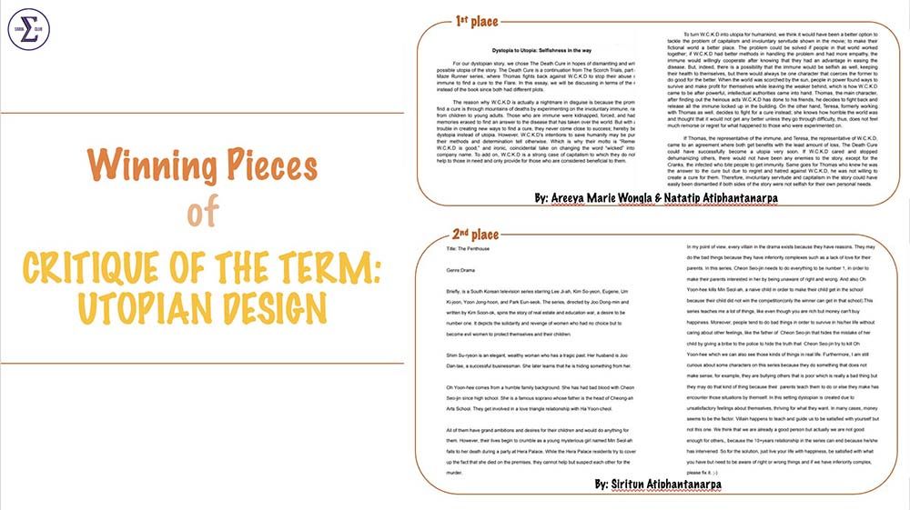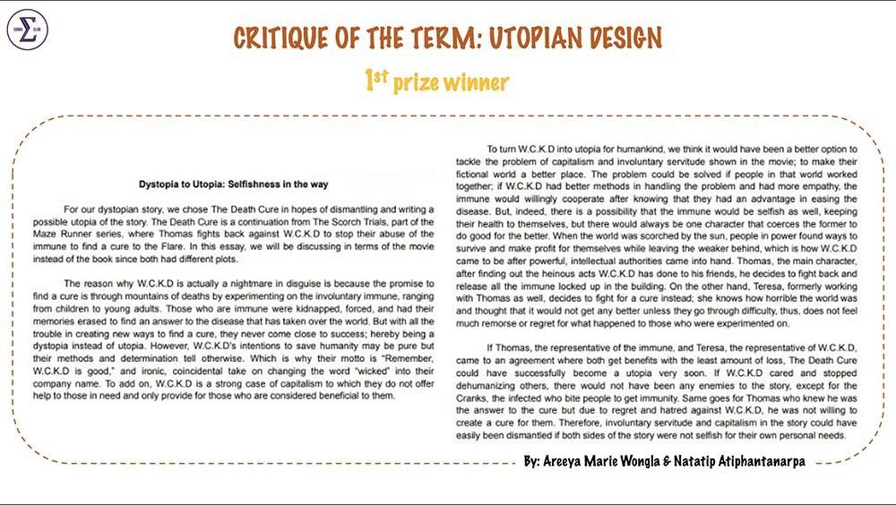 The Sigma Club of Mahidol University International College (MUIC) organized a “Critique of the Term” activity through a contest called “Utopian Design.” This trimester-long activity ran from January 20 to March 19, 2021.