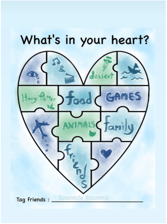 All participants were required to download the heart template given and complete their heart design with things important to them or things they like. They were then asked to decorate and post their finished heart designs on their Instagram Story.