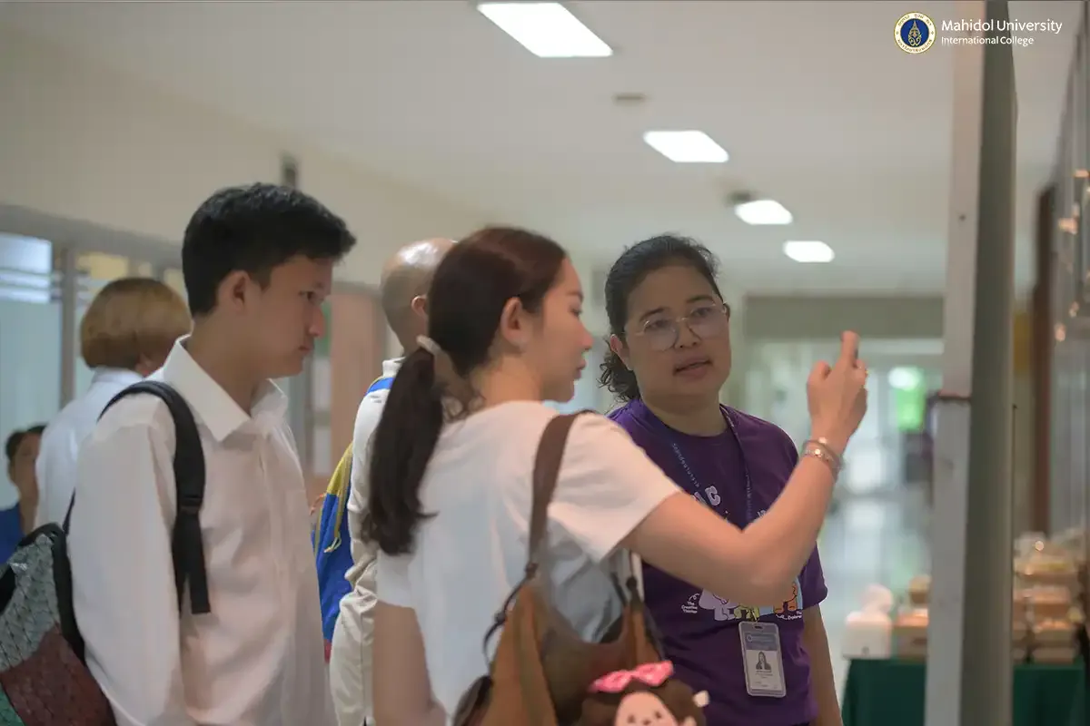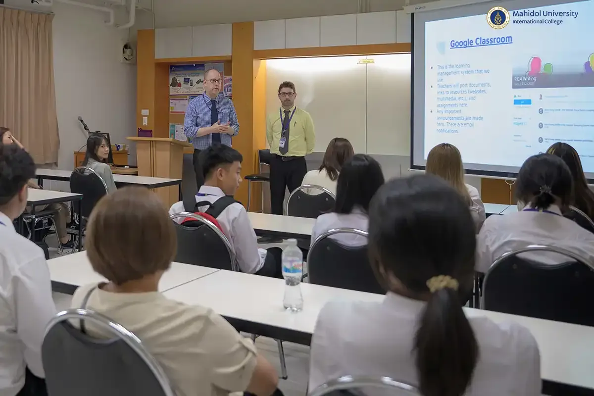 Ms. Satja Sopha, Senior Secretary of PC, Ms. Sutasinee Teekabut, Head of the General Services Unit conducted the next session in Thai. Ms. Pathida Jamorntamakul and Ms. Phim-On Cheevaphitakpol led the English presentation for the international students. They provided general information about the program, including support staff roles, study guidelines, facilities, services, and so on, to help the new students and parents become familiar with the advantages of PC and MUIC.