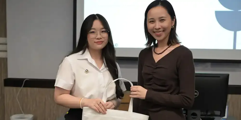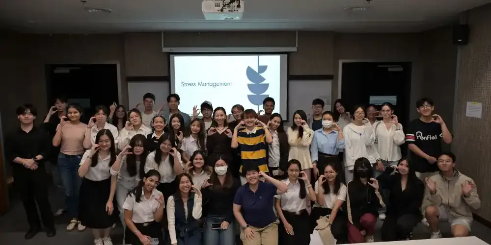 The 53 students who participated in the workshop learned to recognize the signs of stress, such as mental fog, overthinking, and emotional instability. The workshop also featured practical stress management techniques and participants had the opportunity to participate in numerous creative exercises like "Draw My Feelings" and "Hello My Stress". Finally, Khun Papitchaya explained the common causes of stress in our daily lives, such as academic pressure, lifestyle demands, and personality traits like workaholism, low self-esteem and negative self-talk.