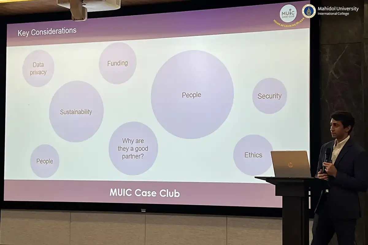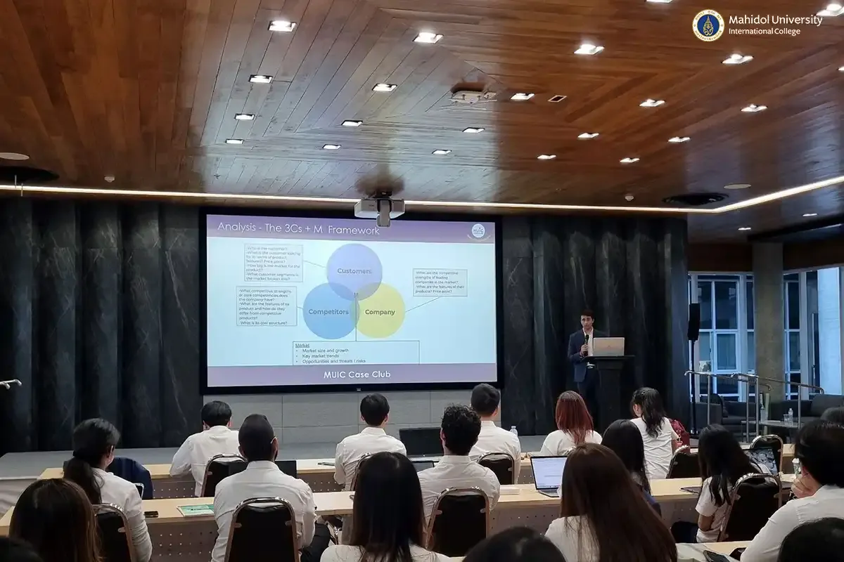 Mahidol University International College’s (MUIC) Case Club hosted a strategy training session led by Mr. Parth Shah, Senior Associate at AWR Lloyd, who was the former Case Club President and an accomplished alumnus with a wide experience in case competitions. Mr. Shah offered club members valuable insights regarding unfolding a case study whilst presenting it at Charinyarasami Hall, 3rd Floor, Aditayathorn Building on December 3, 2024.