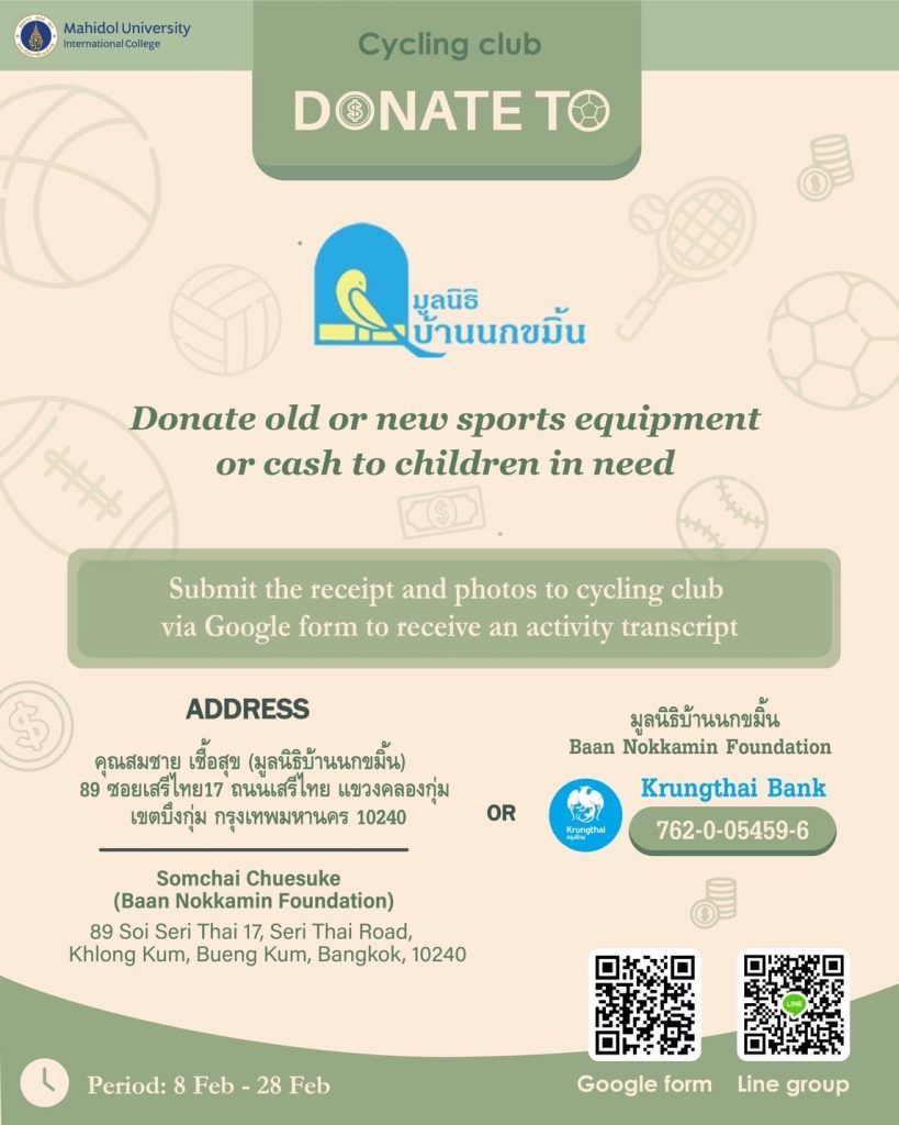 Donate sports equipment to children in need today in the Cycling Club's donate to Baan Nokkamin Foundation activity.