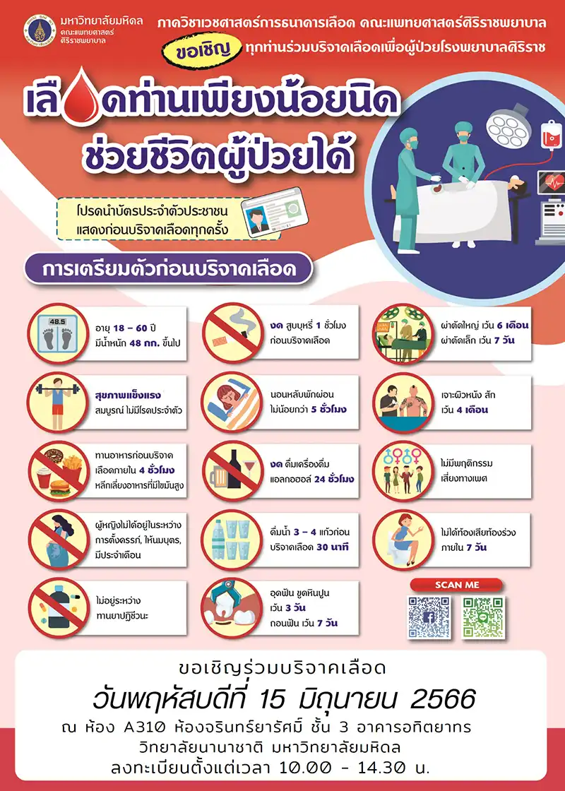 The MUIC Student Association and the Siriraj Hospital will organize a blood donation session on Thursday, June 15, 2023 The blood donation will be held at the Charinyarasami Hall, 3rd floor MUIC Aditayathorn Building from 10.00 a.m. – 02.30 p.m.