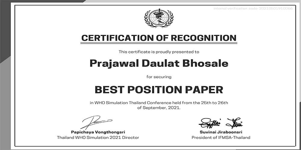 Ms. Prajawal Bhosale, a student in the International Business program, received the “Best Position Paper” and “Best Delegate” awards at the WHO Simulation 2021 Thailand Conference held online on September 26, 2021.