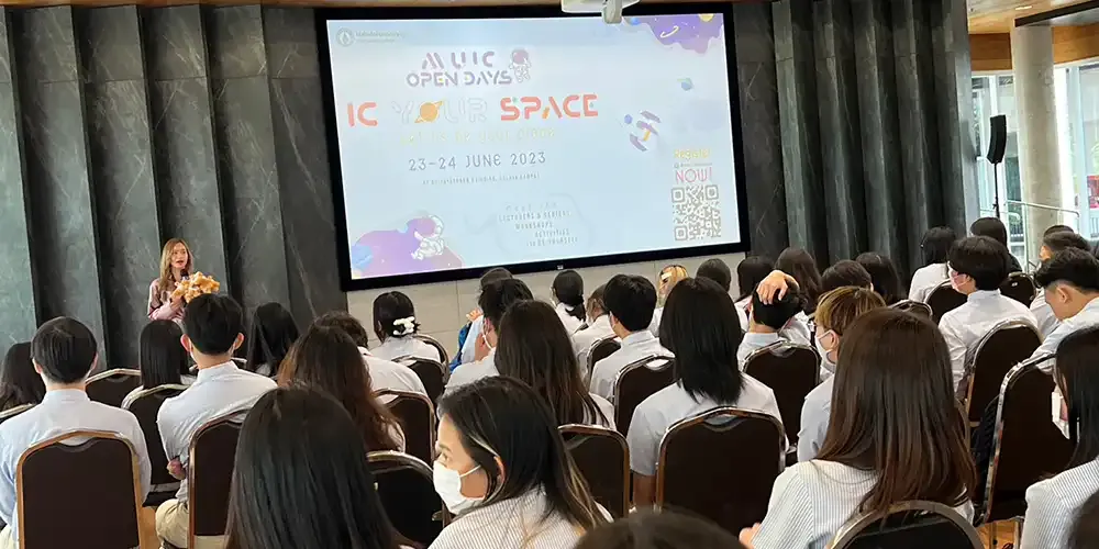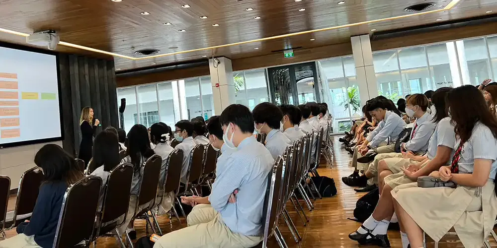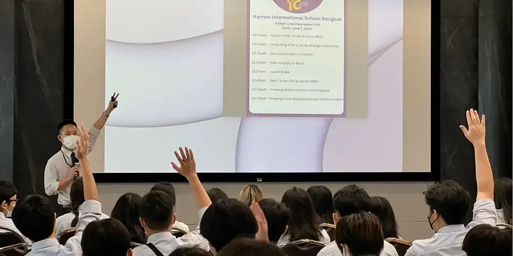 A group of 120 teachers and students from Harrow International School Bangkok visited Mahidol University International College (MUIC) on June 7, 2023 at Charinyarasami Hall, Aditayathorn Building.