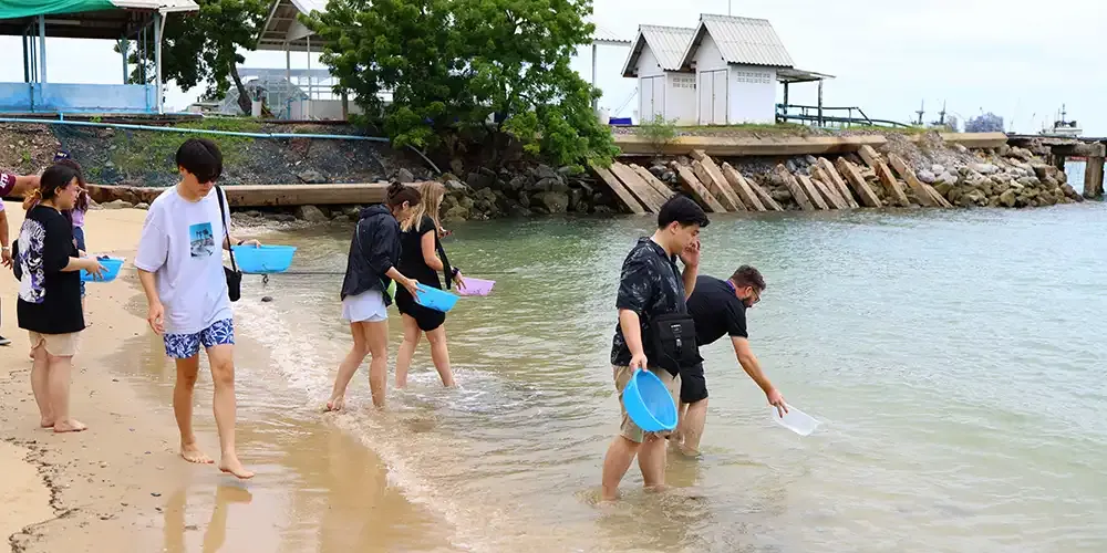 Personnel at the Royal Thai Navy Base in Sattahip warmly welcomed students who registered in the MM program. The sailors introduced coral planting method to the students along with insightful perspectives on sea turtle conservation, which is an important variable that helps control the number of jellyfish, sea grass, and sea sponges to create a natural balance for the students who visited.