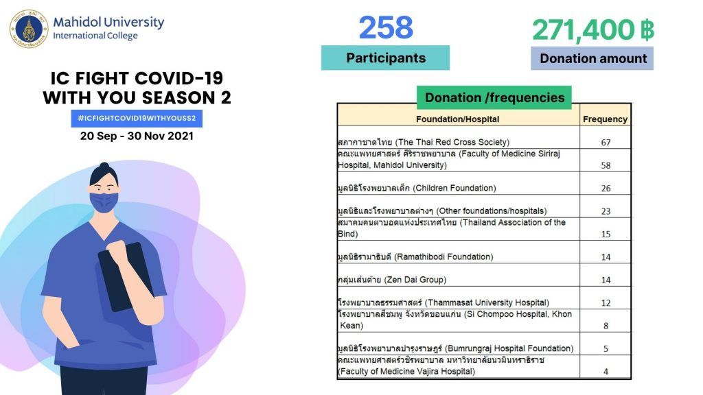 More than 200 students of Mahidol University International College (MUIC) raised a total of 270,400 Baht cash donations during the “IC Fight Covid-19 with You” fundraising campaign from September 20 to November 30, 2021.