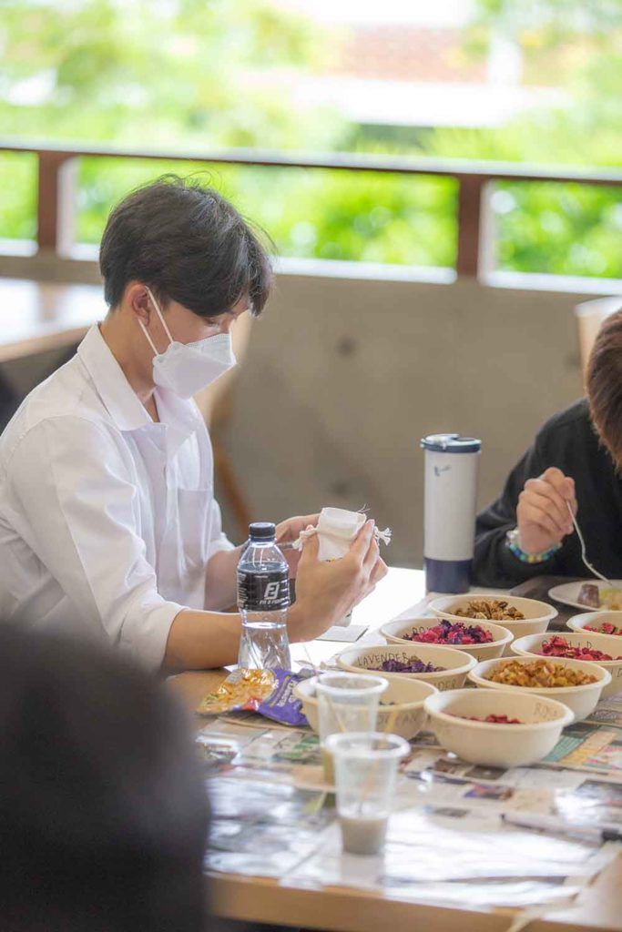 Participants were provided with various types of dried flowers and herbs, together with a small bag so that the participants can customize their own scented bags. In addition, they were also provided acrylic colors if they want to paint their bags too.