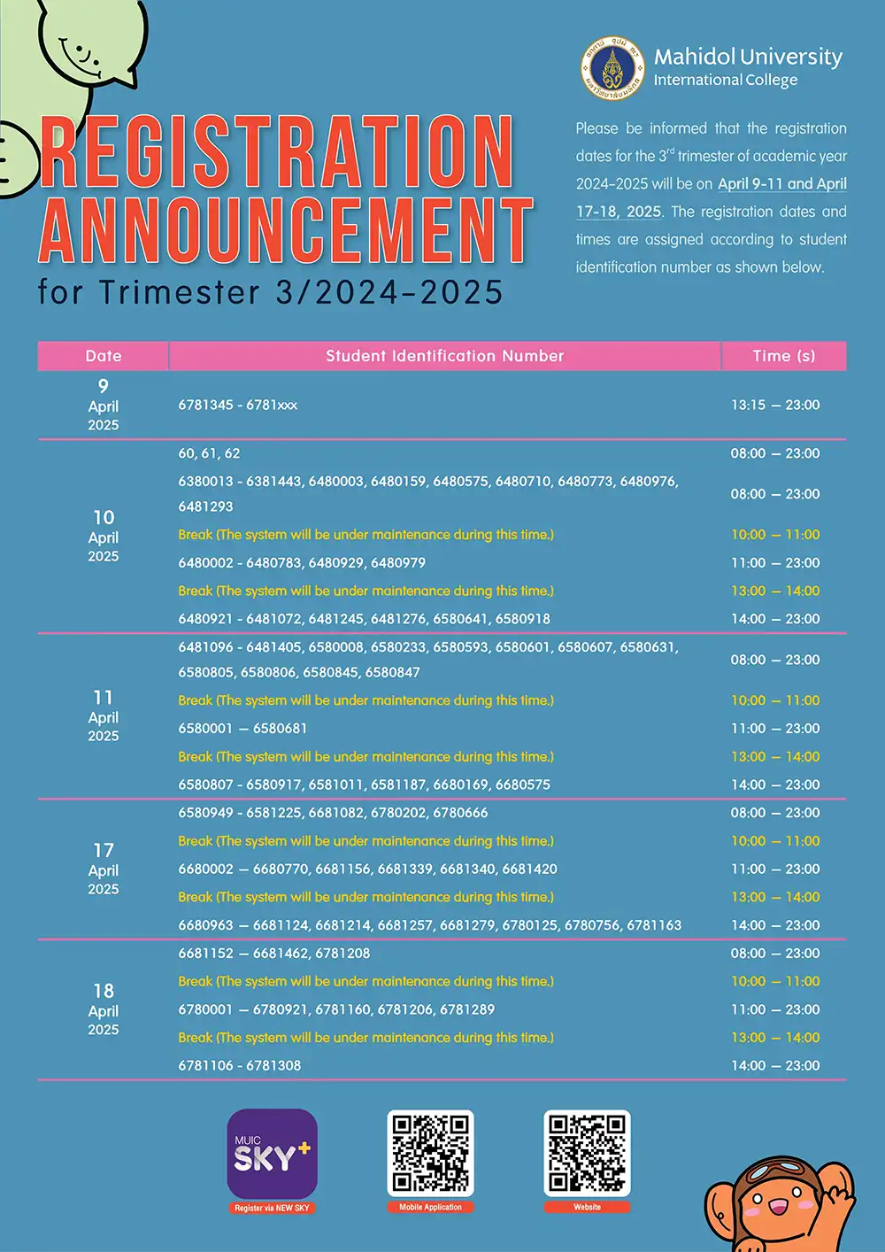 The registration dates for the 3rd trimester of academic year 2024-2025 will be on April 9 -11 and April 17 – 25, 2025. The registration dates and times are assigned according to student identification number as shown below. Show More