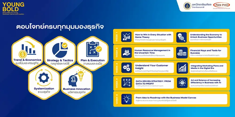The YOUNG BOLD: MICRO-MBA course is an intensive 5-week program designed by Pan Pho Company Limited in collaboration with Mahidol University International College to prepare business owners and new-generation executives who want to build a foundation in business management to extend into competitive advantages in an uncertain world.