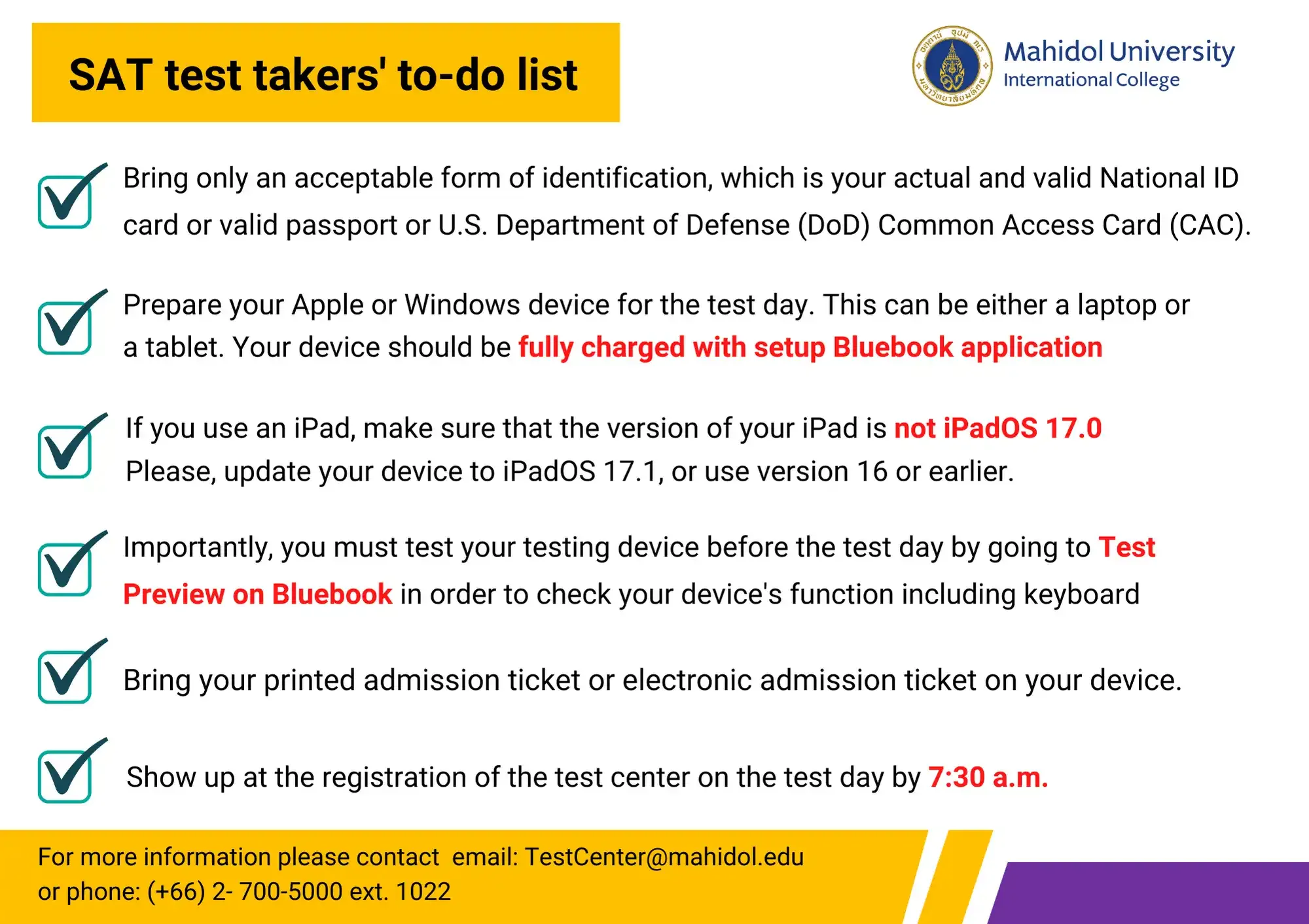 MUIC SAT test center will operate SAT on December 2, 2023. All test takers should show up at the registration by 7:30 a.m. with an actual and valid national ID card or valid passport or U.S. Department of Defense (DoD) Common Access Card (CAC). Also, you need to prepare an admission ticket or e-admission ticket for registration. Importantly, test takers have to bring fully charged devices with installed and set up the Bluebook application for testing.