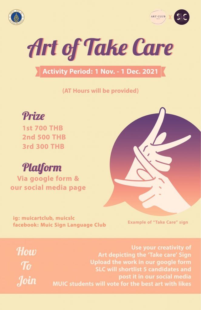 1. Participants are expected to explore their creativity with Art by depicting the “Take Care” sign in ASL in their depiction by November 20th (There’s a sample video on how to sign “Take Care” in the google form)