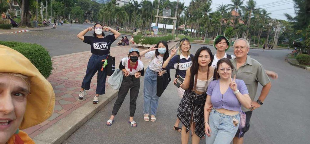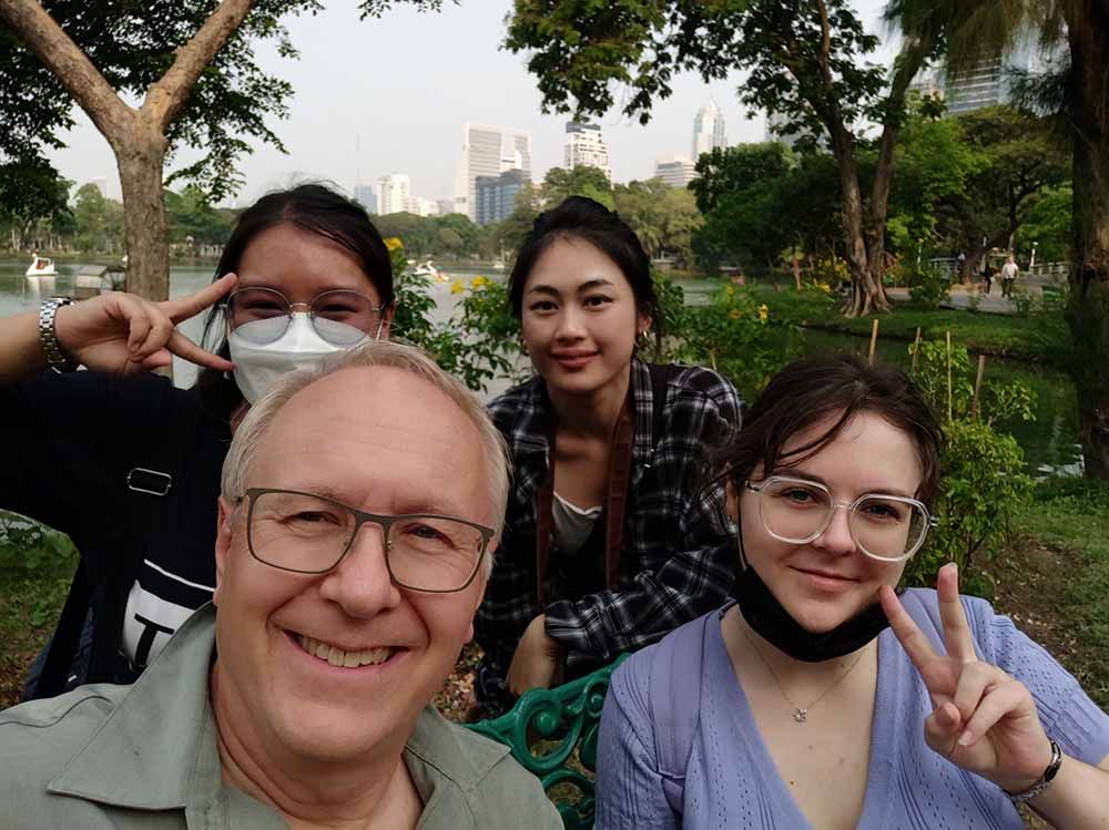 On Saturday, March 11, 2023, a team of volunteers: Pepper, Swan, Amber, Myra, Jinju, Debbie, Pichamon and Ajarn Laird Allan joined Dr. Millicent Young in Lumphini Park to record data – sounds, photographs, 360°video and drawings of the park flora and fauna life.
