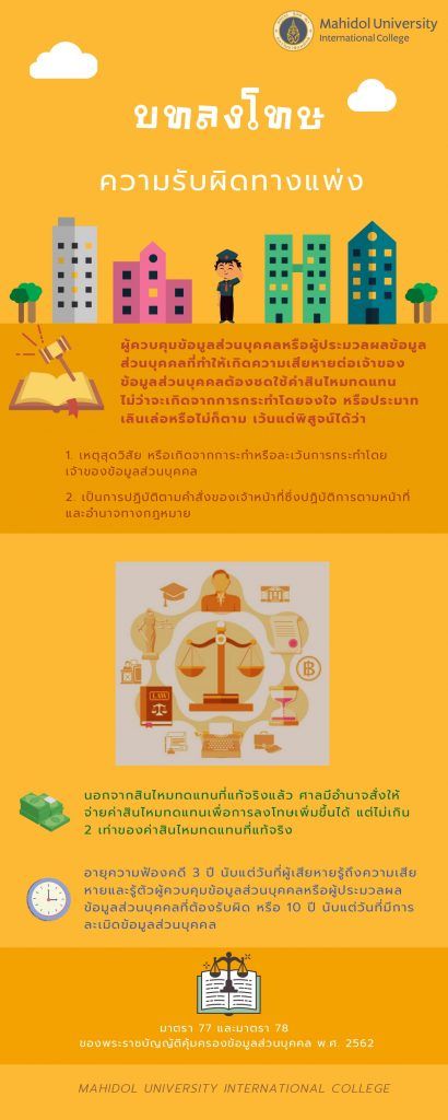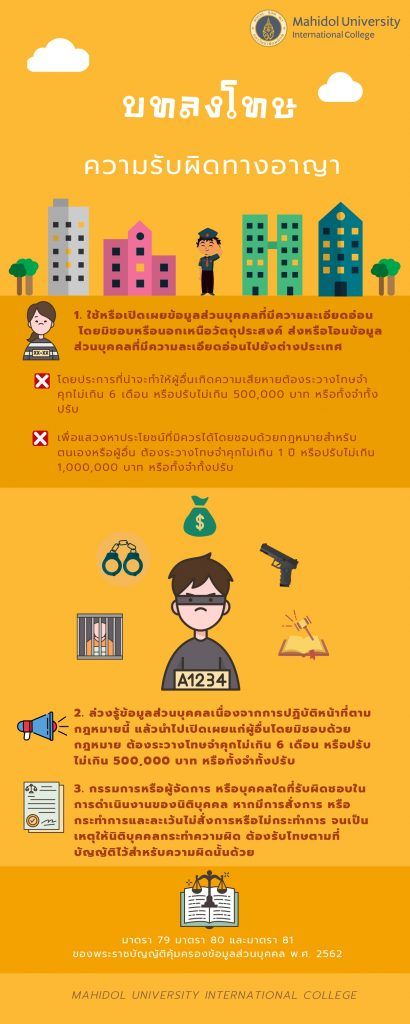 โทษปรับทางปกครอง ไม่เกิน 1,000,000 บาท-การไม่ขอความยินยอมให้ถูกต้องตามกฎหมายหรือไม่แจ้งผลกระทบจากการถอนความยินยอม (มาตรา 19) โทษปรับทางปกครอง ไม่เกิน 3,000,000 บาท-การเก็บรวบรวม ใช้ หรือเปิดเผยข้อมูลส่วนบุคคลโดยปราศจากฐานทางกฎหมาย(มาตรา 24, มาตรา 27)-การเก็บรวบรวม ใช้หรือเปิดเผยข้อมูลผิดไปจากวัตถุประสงค์ที่ได้แจ้งไว้โดยไม่ได้แจ้งวัตถุประสงค์ใหม่หรือมีกฎหมายให้ทำได้ (มาตรา 21)-การเก็บรวบรวมข้อมูลเกินไปกว่าที่จำเป็นภายใต้วัตถุประสงค์อันชอบด้วยกฎหมายของผู้ควบคุมข้อมูลส่วนบุคคล (มาตรา 22)-การเก็บข้อมูลจากแหล่งอื่นที่ไม่ใช่เจ้าของข้อมูลโดยตรงที่ต้องห้ามตามกฎหมาย(มาตรา 25)-การขอความยินยอมที่เป็นการหลอกลวงหรือทำให้เจ้าของข้อมูลส่วนบุคคลเข้าใจผิดในวัตถุประสงค์โทษปรับทางปกครอง ไม่เกิน 5,000,000 บาท-การเก็บรวบรวม ใช้ หรือเปิดเผย การโอนข้อมูลอ่อนไหวโดยไม่ชอบด้วยกฎหมาย (มาตรา 26, มาตรา 27, มาตรา 28, มาตรา 29) โทษทางปกครองของผู้ควบคุมข้อมูล (การไม่ปฏิบัติตามหน้าที่)โทษปรับทางปกครอง ไม่เกิน 1,000,000 บาท-การไม่แจ้งเจ้าของข้อมูลทั้งในกรณีเก็บข้อมูลจากเจ้าของข้อมูลโดยตรงหรือโดยอ้อม (มาตรา 23 หรือมาตรา 25)-การไม่ให้เจ้าของข้อมูลเข้าถึงข้อมูลตามสิทธิ (มาตรา 30)-การไม่จัดให้มีเจ้าหน้าที่คุ้มครองข้อมูลส่วนบุคคล (มาตรา 41)-การไม่จัดให้มีการสนับสนุนการปฏิบัติหน้าที่ของเจ้าหน้าที่คุ้มครองข้อมูลส่วนบุคคลอย่างเพียงพอ หรือการให้ออกหรือเลิกจ้างเจ้าหน้าที่คุ้มครองข้อมูลส่วนบุคคลเพราะเหตุที่ปฏิบัติตามกฎหมายคุ้มครองข้อมูลส่วนบุคคล (มาตรา 42)โทษปรับทางปกครอง ไม่เกิน 3,000,000 บาท-การไม่ดำเนินการตามสิทธิคัดค้านของเจ้าของข้อมูล (มาตรา 32 วรรค 2)-การโอนข้อมูลส่วนบุคคลไปยังต่างประเทศโดยไม่ชอบด้วยกฎหมาย (มาตรา 28,มาตรา 29)-การไม่จัดให้มีมาตรการในการรักษาความมั่นคงปลอดภัยที่เหมาะสม การไม่จัดให้มีระบบตรวจสอบเพื่อลบทำลายข้อมูลหรือไม่ปฏิบัติตามสิทธิในการลบเมื่อถอนความยินยอมหรือตามสิทธิในการขอลบข้อมูลโดยไม่มีเหตุตามกฎหมาย การไม่แจ้งเหตุละเมิดข้อมูล หรือการไม่ตั้งตัวแทนในราชอาณาจักร