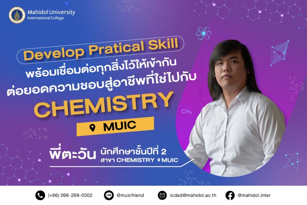 บนความยากแต่กลับสนุกและพัฒนาทักษะวิทยาศาสตร์ได้อย่างไม่น่าเชื่อ ทำให้ “พี่ตะวัน” นักศึกษาชั้นปีที่ 2 สาขาเคมี คณะวิทยาศาสตร์เลือกเรียนในสาขานี้และพร้อมที่จะต่อยอดอาชีพในอนาคตในเส้นทางที่หลากหลายไปกับ MUIC นั่นเอง