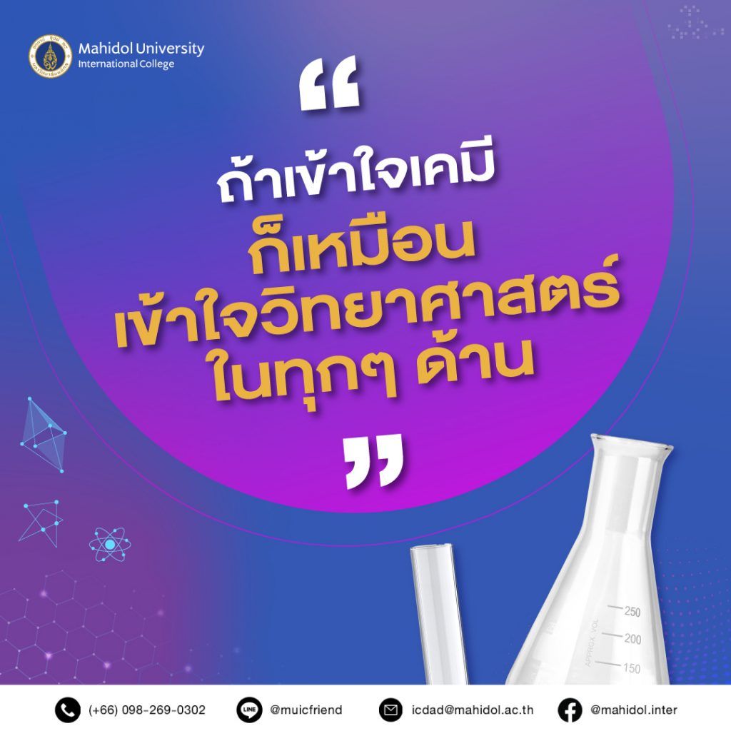 สาขาเคมี คณะวิทยาศาสตร์ MUIC พร้อมต้อนรับน้องๆ ที่สนใจและอยากต่อยอดในสาขานี้ด้วยเทคโนโลยีที่ทันสมัย หลักสูตรที่ได้รับการยอมรับในระดับสากล รวมถึงปฏิบัติการที่จัดเต็มเพื่อพัฒนาทักษะของทุกคนได้อย่างเต็มประสิทธิภาพ ไม่อยากพลาดเป็นส่วนหนึ่งกับคณะวิทยาศาสตร์แบบนี้ ต้องติดตามที่ MUIC Official Fanpage เท่านั้นนะ สอบถามเพิ่มเติมได้ที่ LINE ID: @muicfriend