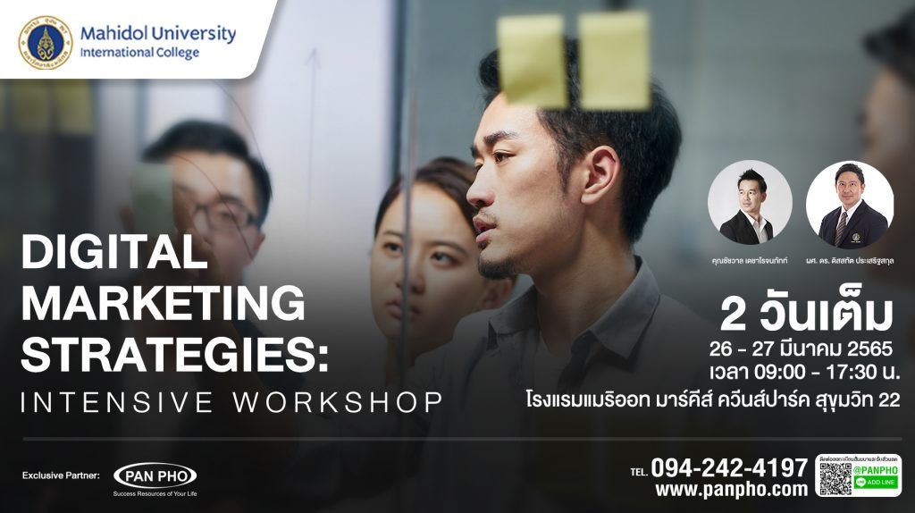 ด้วยความสำคัญของกลยุทธ์ จึงทำให้บริษัท แพน โฟ จำกัด ร่วมกับ วิทยาลัยนานาชาติ มหาวิทยาลัยมหิดล จัดสัมมนา Digital Marketing Strategies ขึ้นมาเพื่อให้ความรู้ผู้เรียนเพื่อสร้างสรรค์กลยุทธ์และวิธีการทางธุรกิจเพื่อการเติบโตอย่างมั่นคงดำเนินการสอนโดย 2 วิทยากรมากประสบการณ์ ได้แก่ ผศ. ดร. ดิสสทัต ประเสริฐสกุล - อาจารย์ประจำ วิทยาลัยนานาชาติ มหาวิทยาลัยมหิดล และผู้เชี่ยวชาญด้านการวางกลยุทธ์ธุรกิจ และ คุณ ชัชวาล เดชาโรจนภัทท์ - อดีต CMO บริษัท ฟินันเซีย ไซรัส จำกัด (มหาชน)