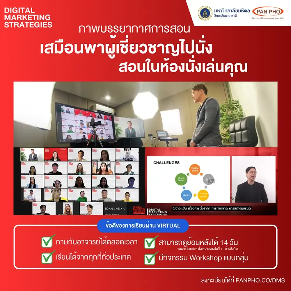 ด้วยความสำคัญของกลยุทธ์ จึงทำให้บริษัท แพน โฟ จำกัด ร่วมกับ วิทยาลัยนานาชาติ มหาวิทยาลัยมหิดล จัดสัมมนา Digital Marketing Strategies ขึ้นมาเพื่อให้ความรู้ผู้เรียนเพื่อสร้างสรรค์ กลยุทธ์ และวิธีการทางธุรกิจเพื่อการเติบโตอย่างมั่นคง ดำเนินการสอนโดย 2 วิทยากรมากประสบการณ์ ได้แก่ ผศ. ดร. ดิสสทัต ประเสริฐสกุล - อาจารย์ประจำ วิทยาลัยนานาชาติ มหาวิทยาลัยมหิดล และผู้เชี่ยวชาญ ด้านการวางกลยุทธ์ธุรกิจ และ คุณชัชวาล เดชาโรจนภัทท์ - อดีต CMO บริษัท ฟินันเซีย ไซรัส จำกัด (มหาชน) พร้อมรับใบประกาศนียบัตรจาก วิทยาลัยนานาชาติ ม.มหิดล เมื่อจบหลักสูตร โดยจัดเป็นรุ่นที่ 7 ในวันเสาร์ที่ 3 – อาทิตย์ที่ 4 สิงหาคม 2567 เวลา 9.00 - 17.00 น. ผ่านทางโปรแกรม ZOOM รับสมัครจำนวนจำกัด สามารถสมัครได้แล้ววันนี้ผ่านทาง Website: https://panpho.co/dms หรือ ผ่านทาง LINE: @PANPHO
