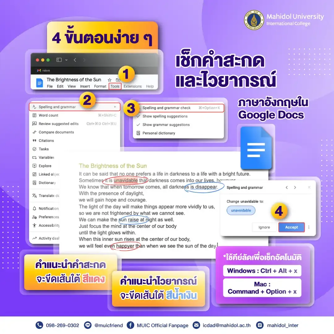 MUIC มีเคล็ดไม่ลับสำหรับคนที่ใช้ Google Docs แล้วอยากจะเช็กคำสะกดและไวยากรณ์ภาษาอังกฤษให้เป๊ะ ขั้นตอนมีอะไรบ้าง? มาดูกันได้เลย
