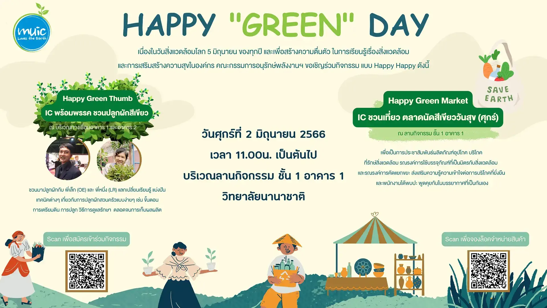 คณะกรรมการอนุรักษ์พลังงานและสิ่งแวดล้อมฯ ขอเชิญทุกท่านเข้าร่วมกิจกรรม Happy “Green” Day ในวันศุกร์ที่ 2 มิถุนายน 2566 เวลา 11.00 น. เป็นต้นไป ซึ่งกิจกรรมประกอบด้วย