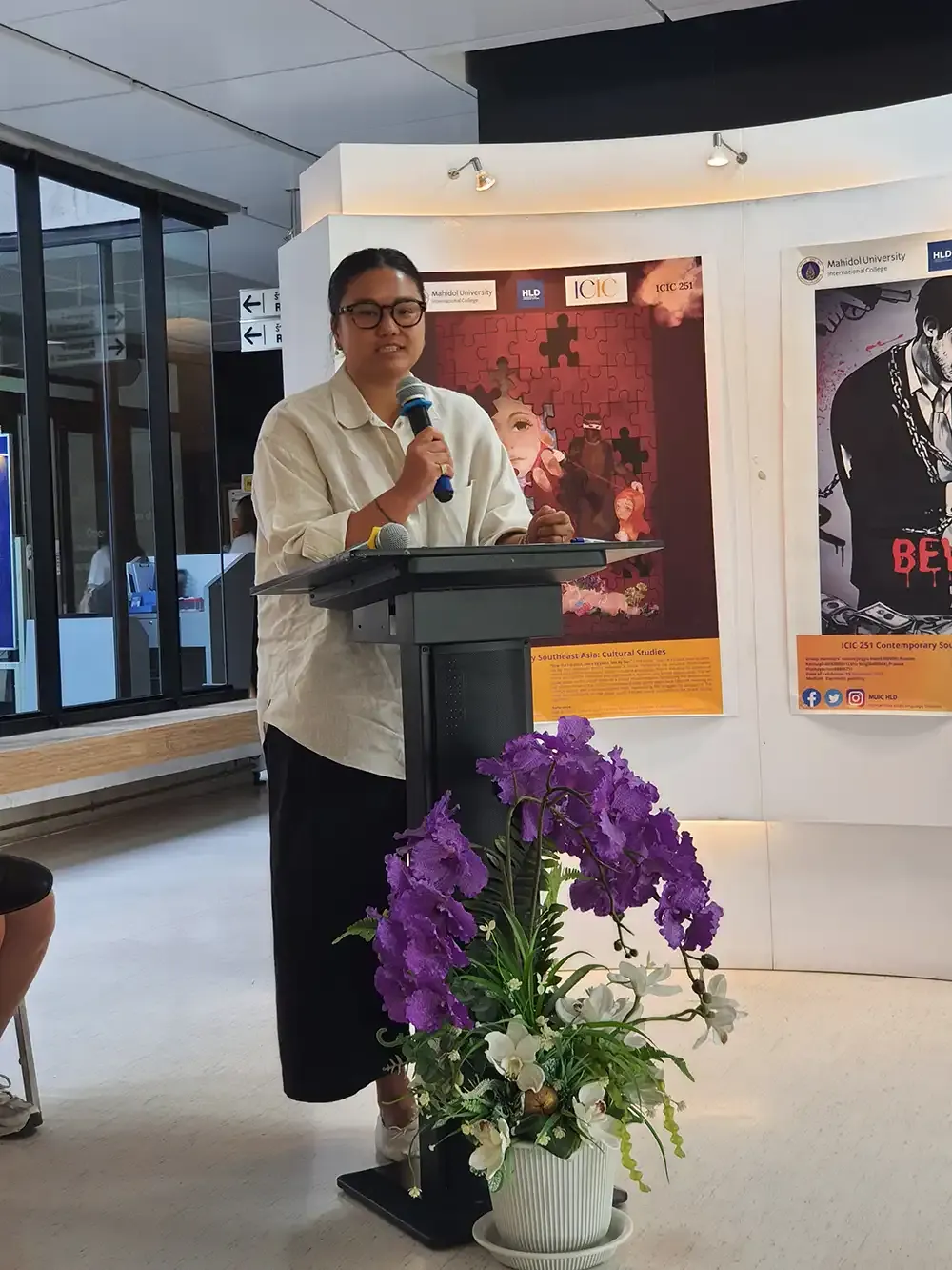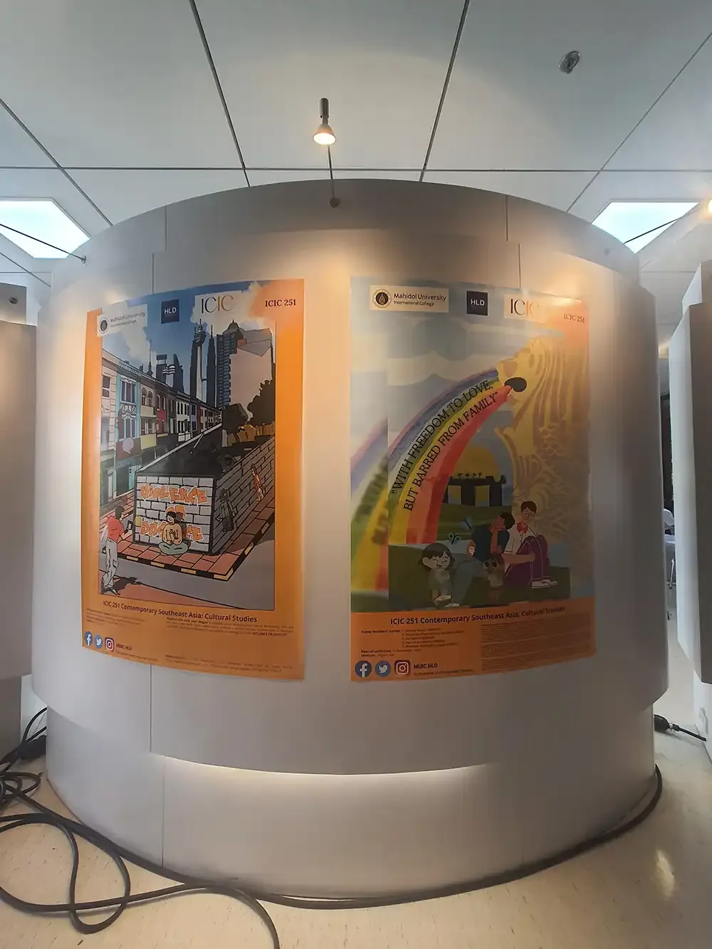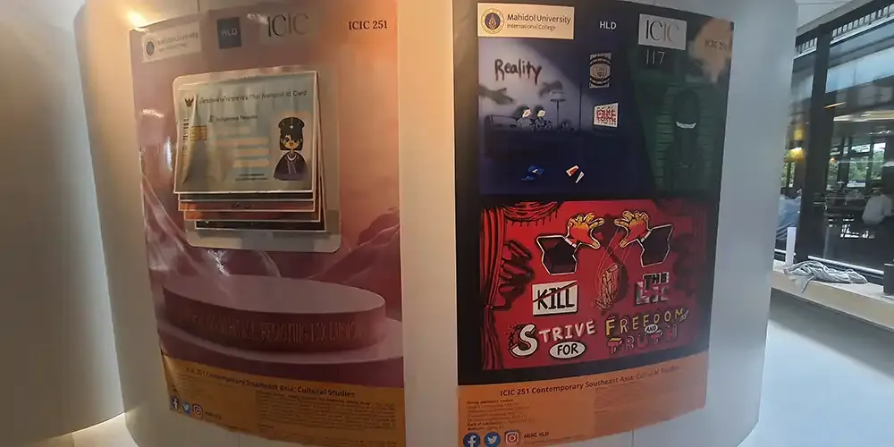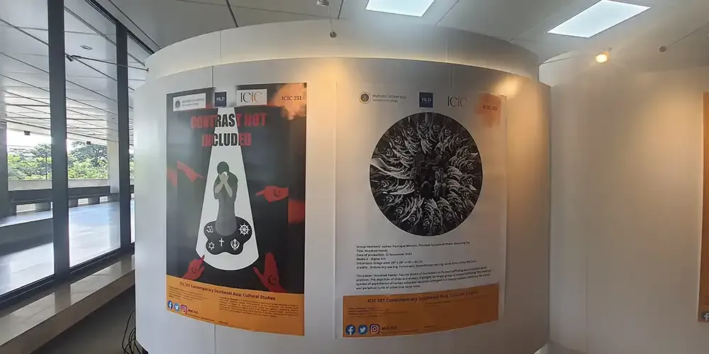 The Intercultural Studies and Languages (ICIC) students of ICIC 251 Contemporary Southeast Asia: Cultural Studies staged an exhibition of posters they have made that demonstrated their knowledge and understanding of selected social and cultural issues. With its opening ceremony on November 15, 2023, the exhibition in the Ground Floor Lobby of Aditayathorn Building will run until November 22, 2023.